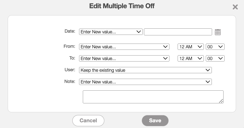This pop-up window will allow you to update the "Date," "From," "To," "User," and "Note" fields. Simply use the drop-down for the chosen fields to select the new value. Choosing the "Enter New Value" option will allow you to enter the new date, time range, or note:
