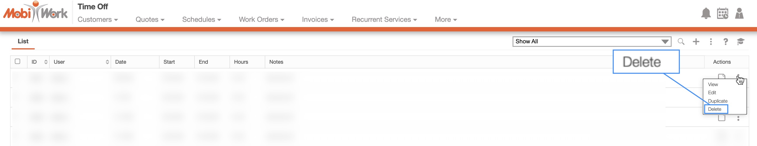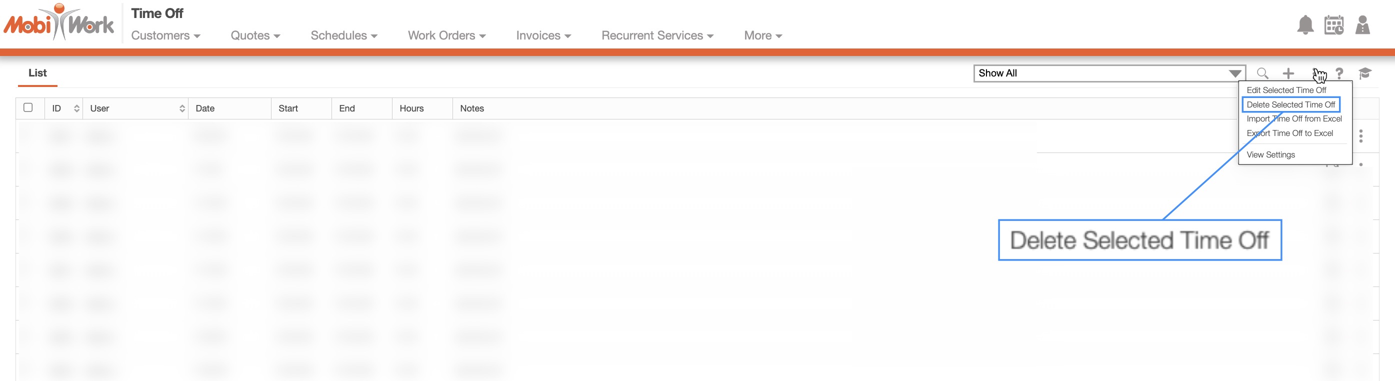 MobiWork allows you to delete multiple time off entries through the web user interface. To delete multiple entries, first navigate to the Time Off List page. Then selected the entries you would like to delete. Once selected, click the More Actions button and from the drop-down select the "Delete Selected Time Off" option: