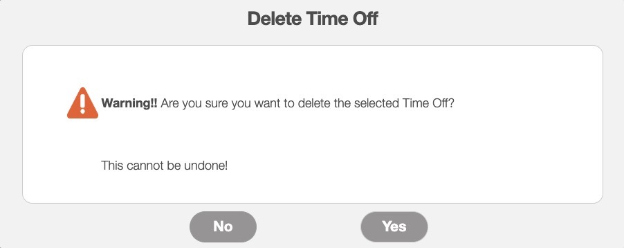 The Delete Time Off pop-up window will appear, asking you to confirm if you would like to delete the selected entries. Click the Yes button to confirm deletion: