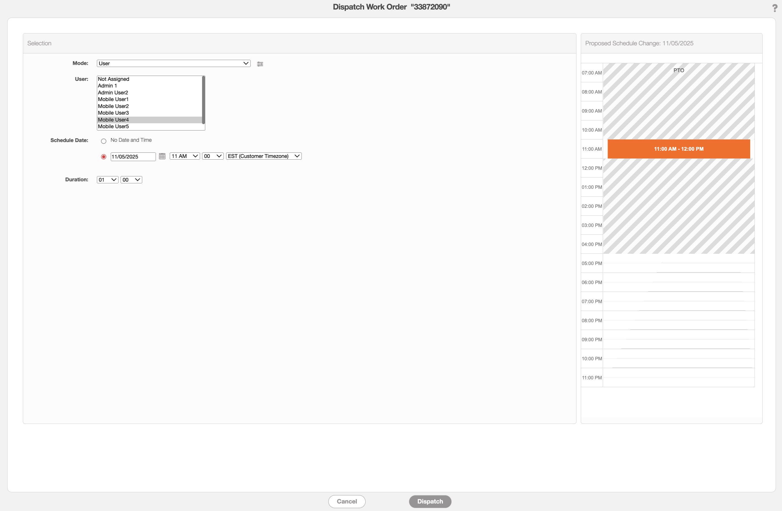 The "User" field will allow you to select from your list of MobiWork users.
