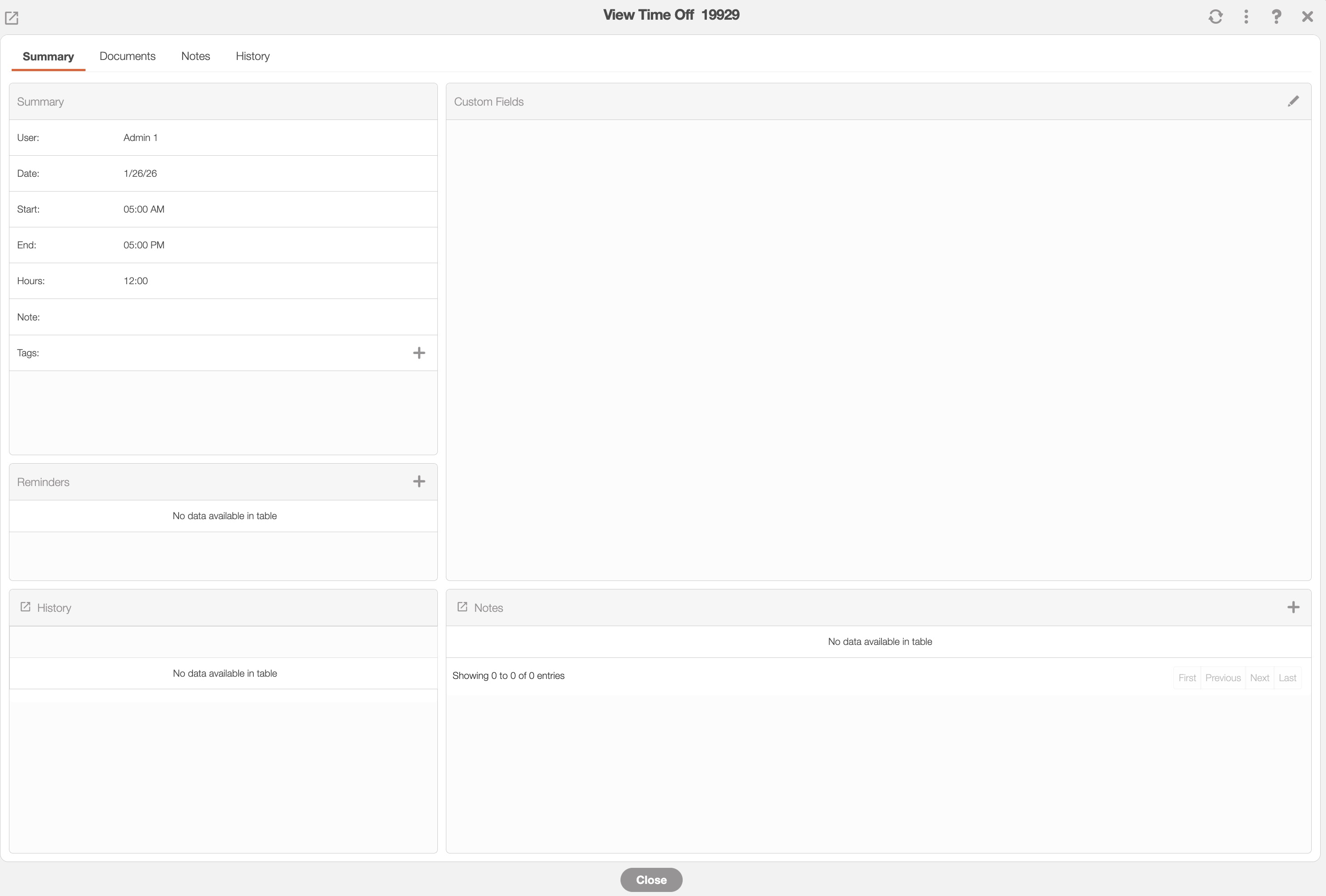 And any relevant notes regarding the time off entry.
