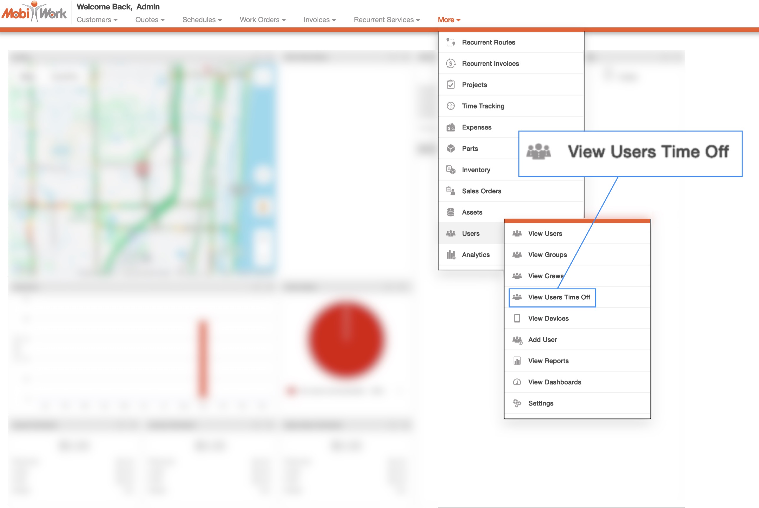 The Time Off List page will allow you to view all your users' time off requests. You can access this page by hovering over the Users feature in the MobiWork menu and clicking on the "View Users Time Off" option:
