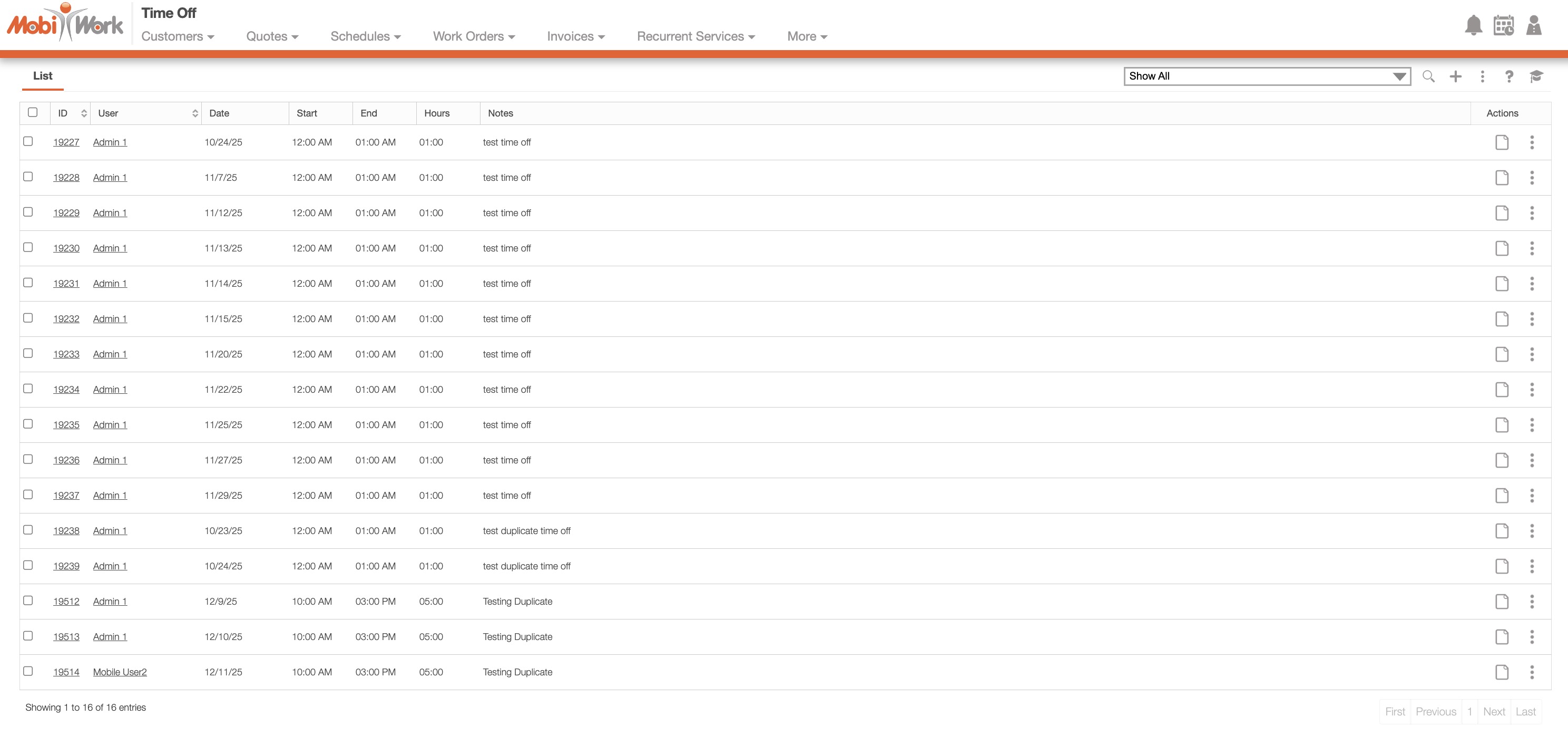 Whether adjusting a single vacation request or updating multiple sick-day entries, MobiWork ensures accurate scheduling and seamless coordination across your team. MobiWork simplifies the process of managing employee time off by allowing you to create, view, and modify entries directly from both the web interface and the mobile app. This section will go over some commonly asked questions regarding the time off feature.