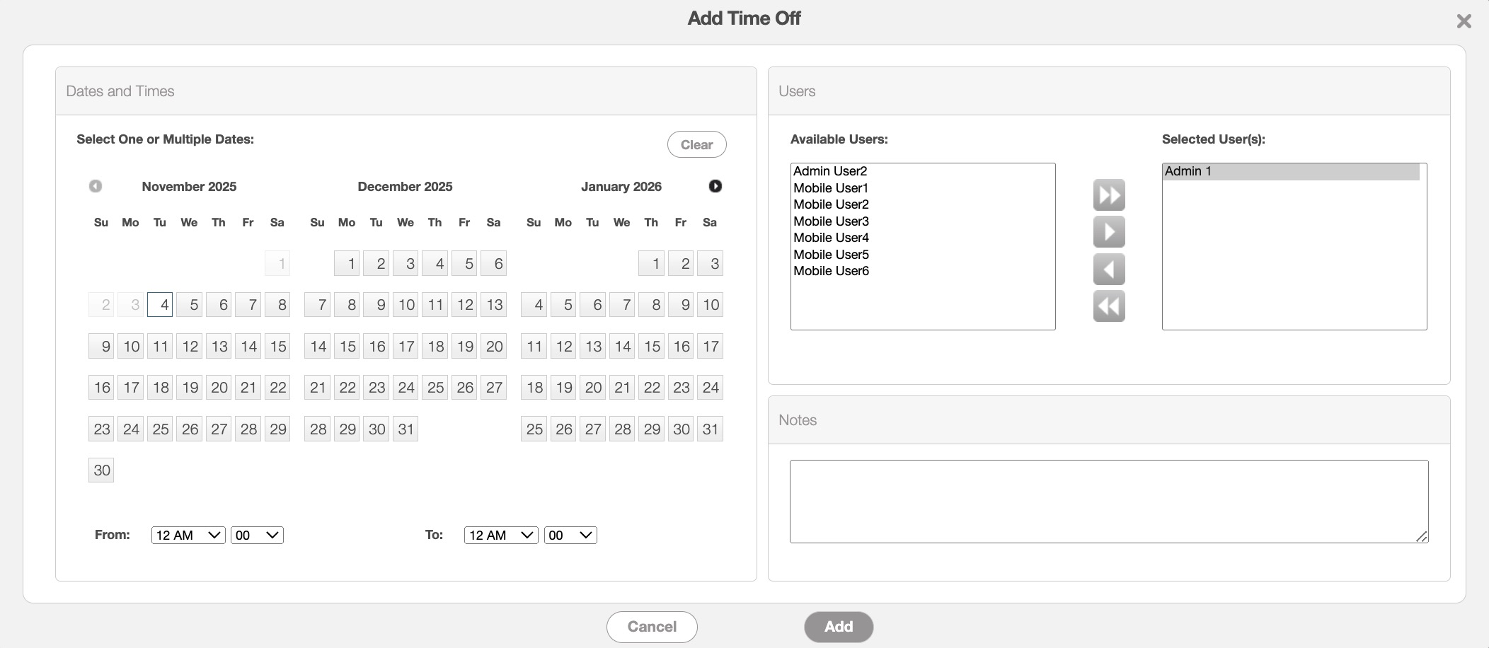 The user(s) that the time off entry is scheduled for. You can hold the Command key (Mac) or the Shift key (Windows) to select multiple users. With the designated arrows, you can move the specified users left or right.