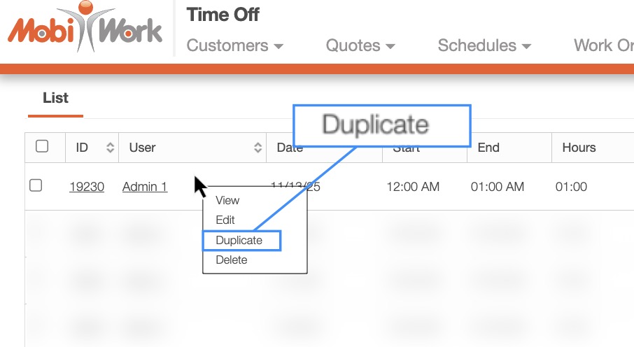 MobiWork allows you to easily duplicate existing time off entries. This feature is especially useful when you need to create additional time off entries for the same user. For example, if a user is sick and requires an additional day off, you can quickly duplicate their previous sick-day details. The note and time frame will remain unchanged, only the dates will need to be updated.