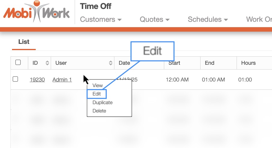 MobiWork allows you to edit existing time off entries. There are several different ways you can edit a time off entry. In this example we will right-click on the selected entry. Then from the drop-down select the "Edit" option:
