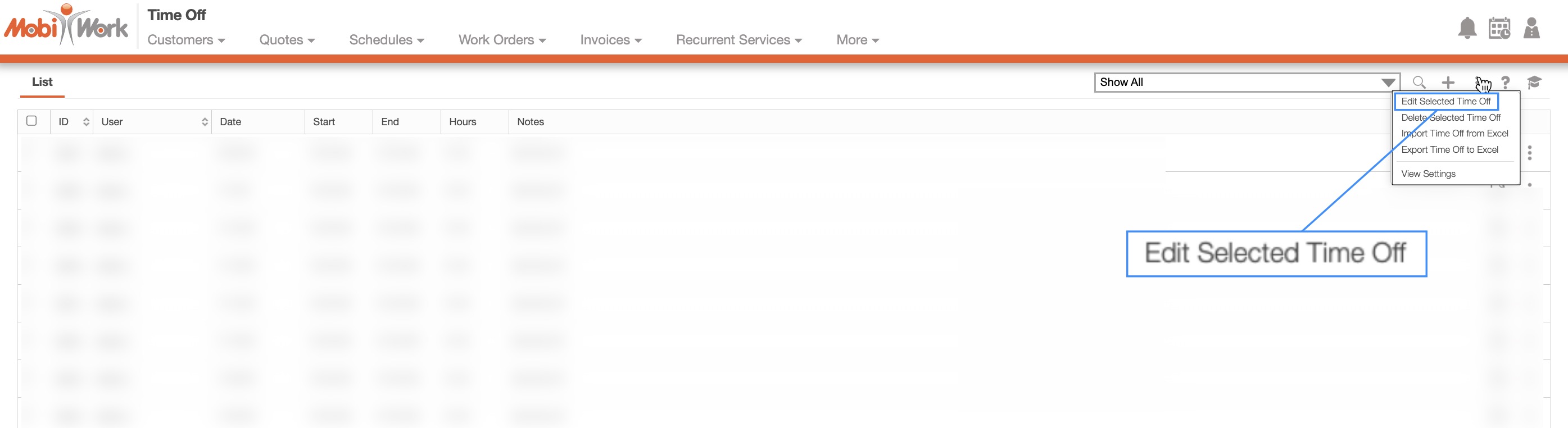 MobiWork allows you to edit multiple time off entries through the web user interface. To edit multiple entries, first navigate to the Time Off List page. Then selected the entries you would like to update. Once selected, click the More Actions button and from the drop-down select the "Edit Selected Time Off" option:
