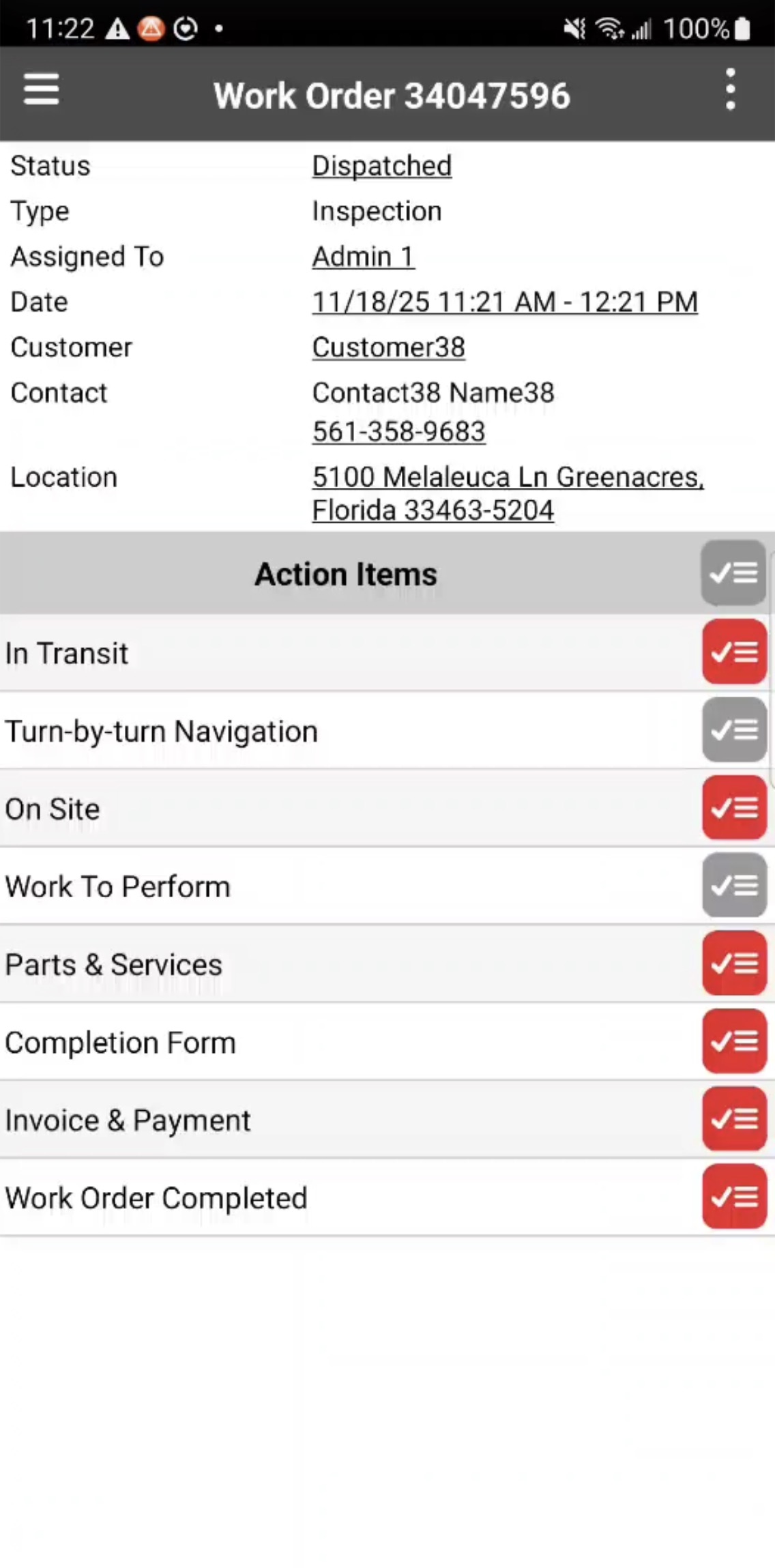 On the device, have the crew leader access the assigned work order and then complete the requisite action items:
