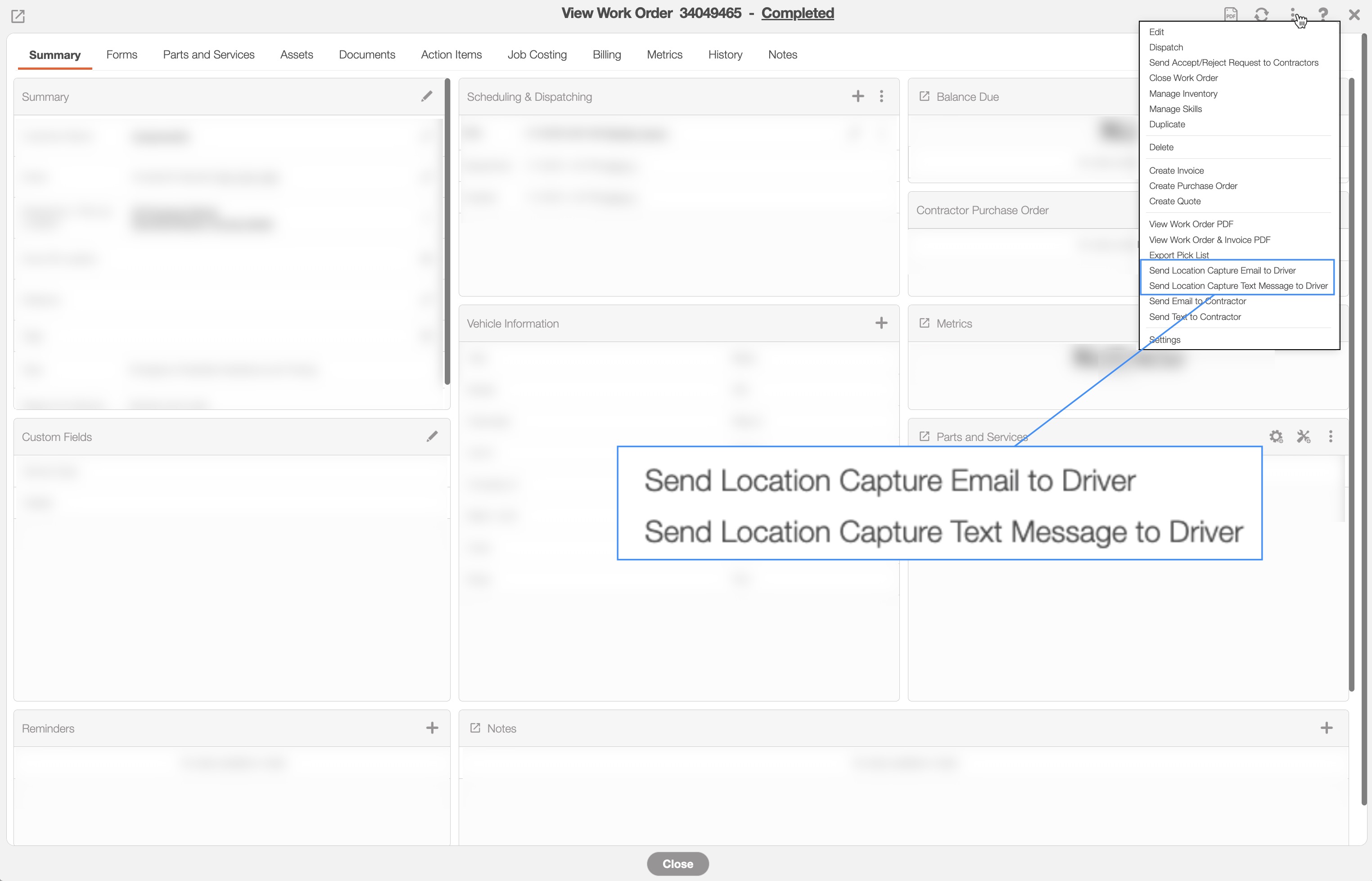 In the View Work Order pop-up window, click on the Individual Actions button and select either the "Send Location Capture Email to Customer" option or the "Send Location Capture Text Message to Customer" option from the drop-down menu: