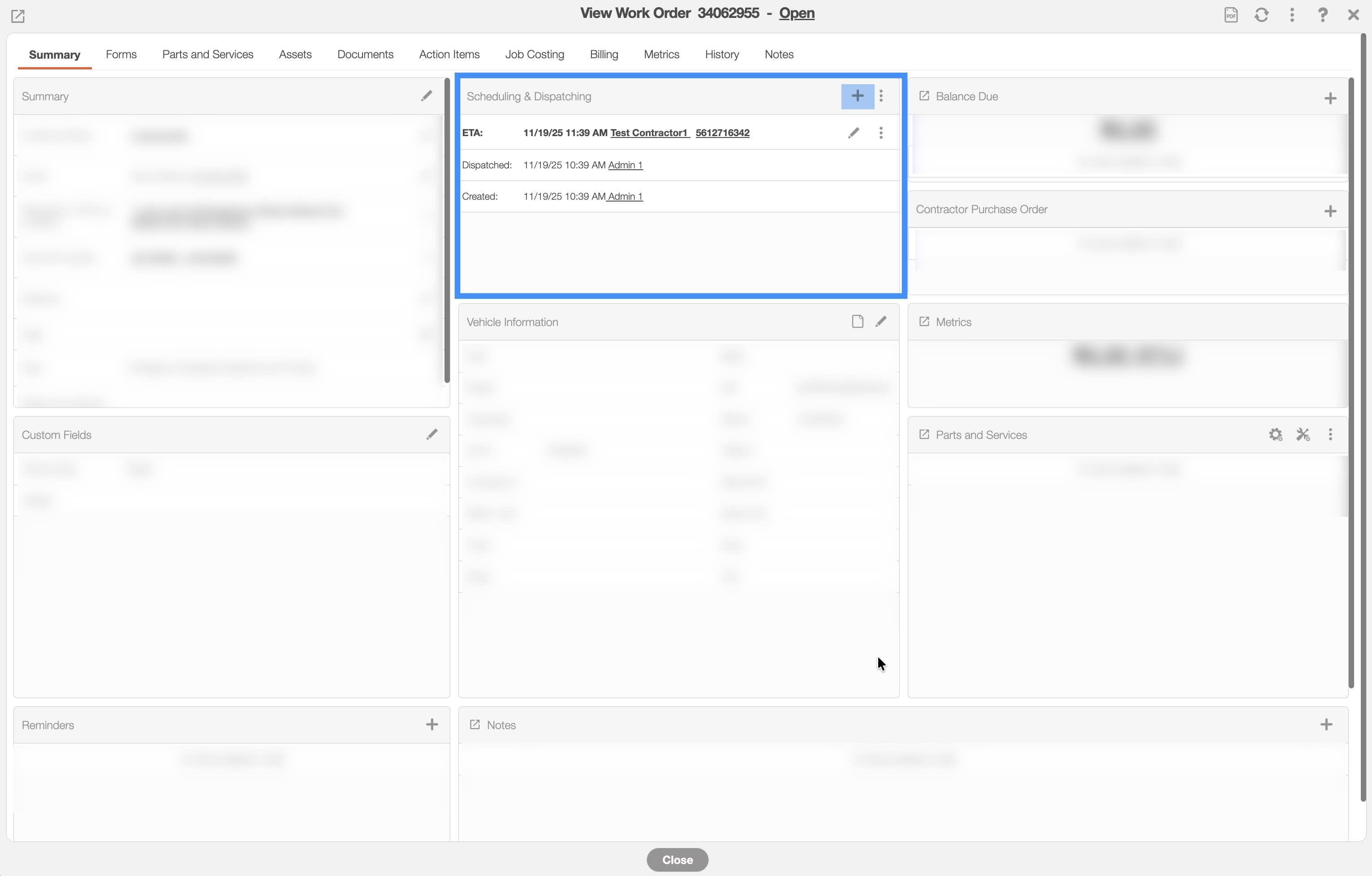 First, open the corresponding View Work Order pop-up window, then locate the "Scheduling and Dispatching" panel. From this panel, click on the Plus Sign icon to initiate a new dispatch for your users, vendors, or contractors: