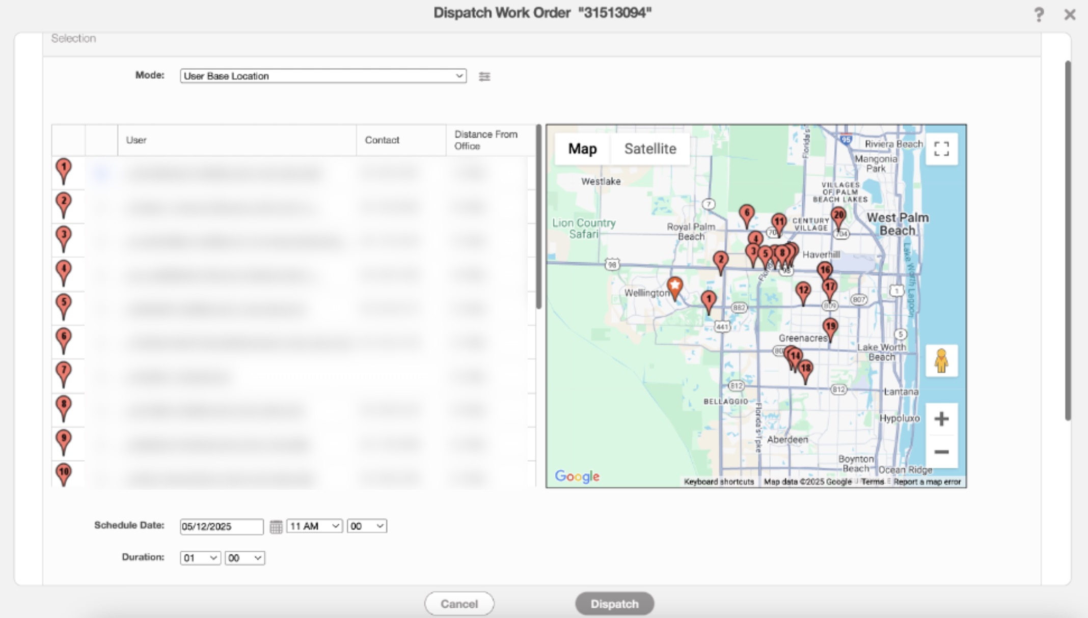 This window will display a list of the closest available external vendors, contractors, or internal users based on the caller's location. The caller's location is displayed as a star on the map.