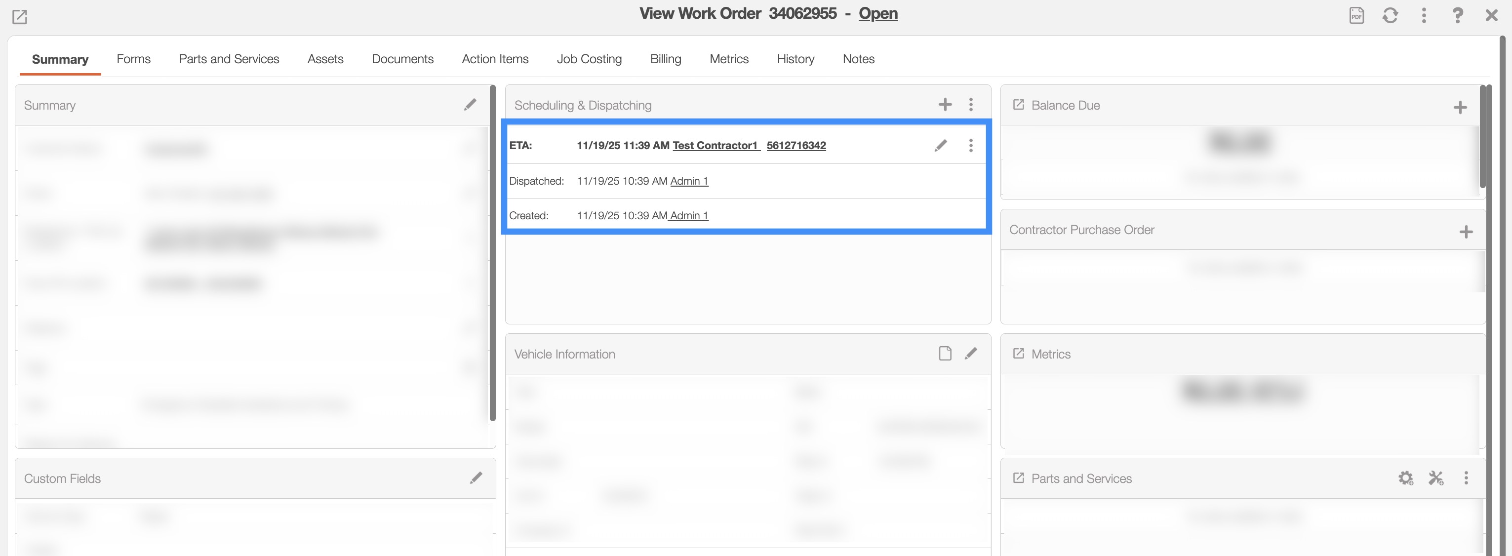 Once the work order is dispatched, the contractor's, user's, or vendor's name, along with the dispatch date and time, will automatically populate on the work order page. The contractor, user, or vendor will also receive an email and text message with the job details: