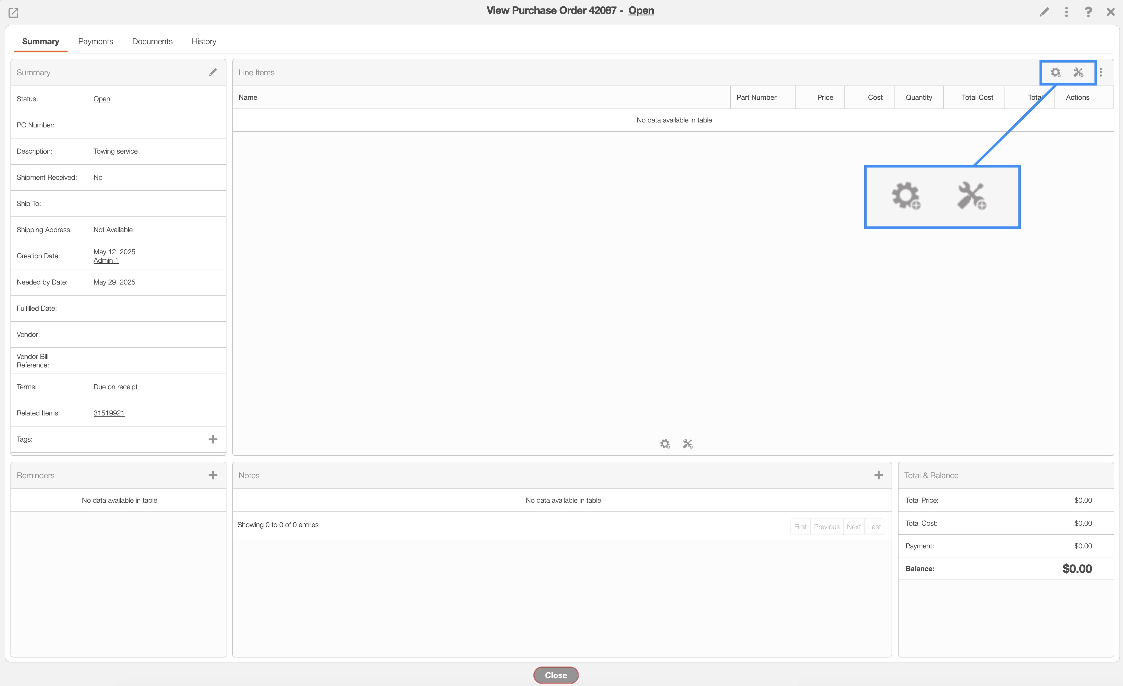 This approach keeps the interface streamlined for service-focused work orders while still ensuring that all necessary functions are available. Any parts and services added to the invoice will automatically populate in the work order's parts and services section.