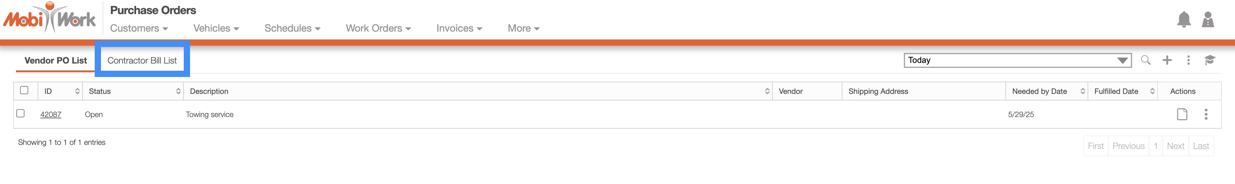 To track the status of submitted bills, navigate to the Vendor PO List tab or the "Contractor Bill" tab on the Purchase Order List page: