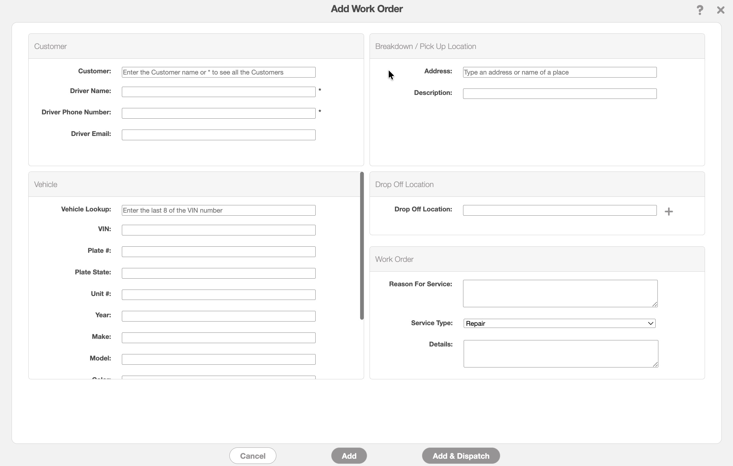 The Add & Dispatch button will allow you to save the work order information and dispatch it simultaneously.