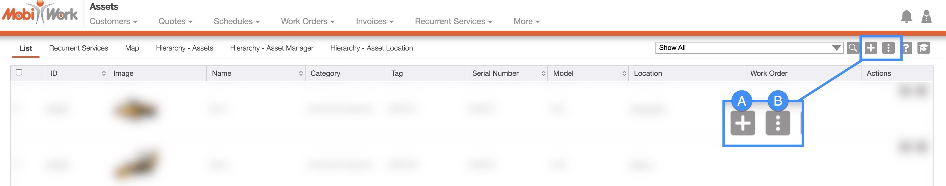 There are a variety of different ways that you can add a new asset into MobiWork. The subsections below will expound upon the different ways you can add a new asset.