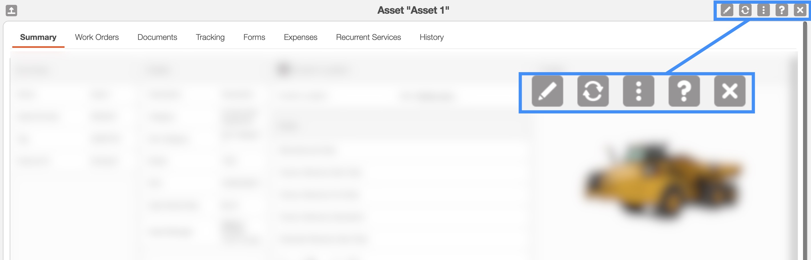 In the upper right corner of the View Asset pop-up window there will be five buttons that will allow you to perform additional actions on the asset: