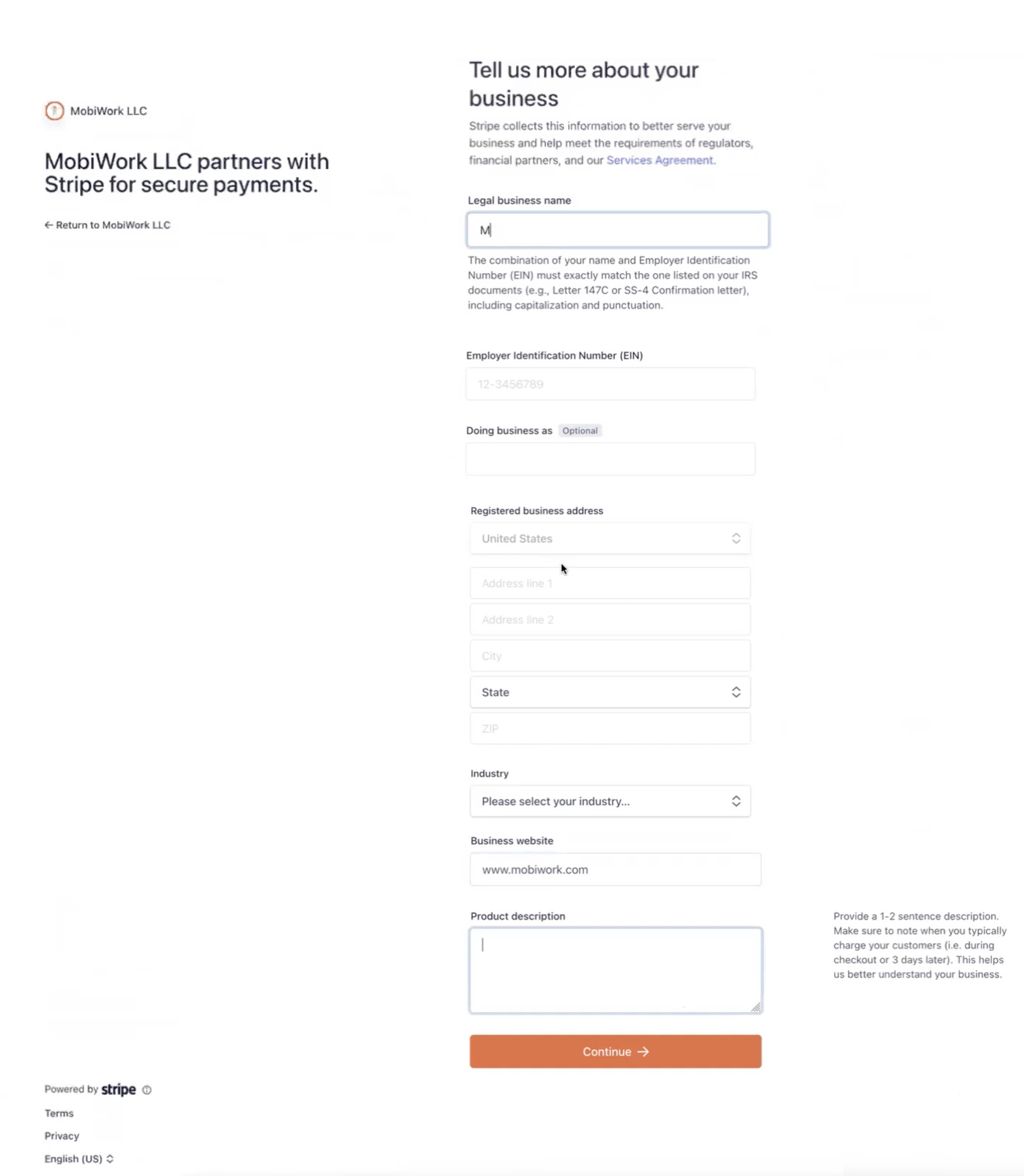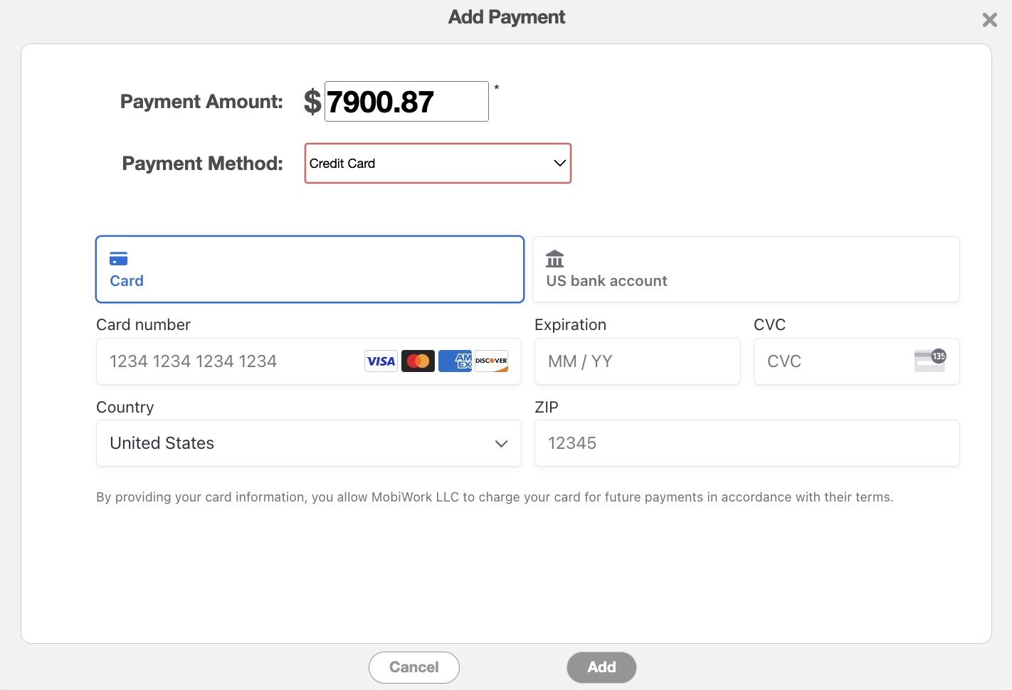 Note: the credit card information will automatically be stored in Stripe's secure vault, not on MobiWork's servers.