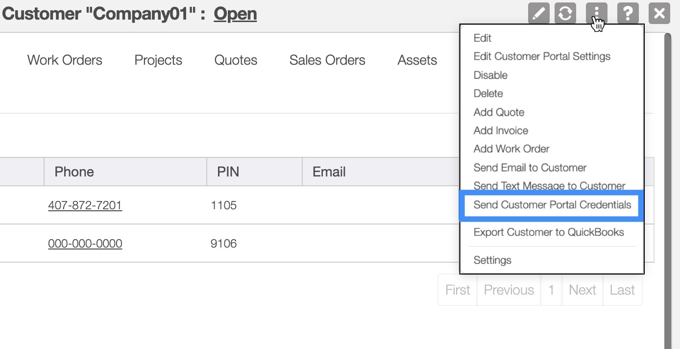 Please note that the customer phone number and PIN will always be used for the customer to access the web portal. You can also find this information in the "Contacts" tab of the View Customer pop-up window: