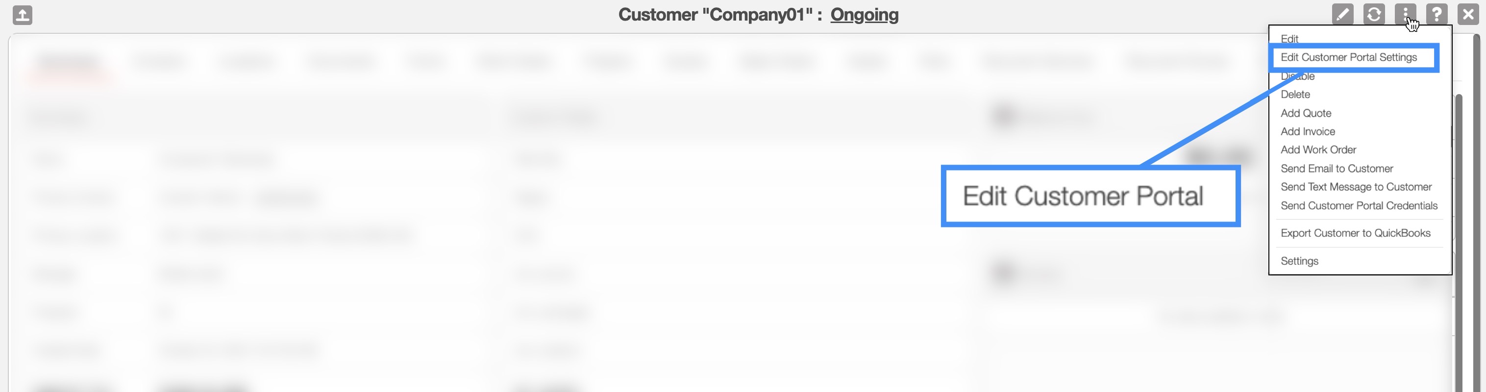 Once you have opened the View Customer pop-up window, select the "Edit Customer Portal" option from the Individual Actions drop-down: