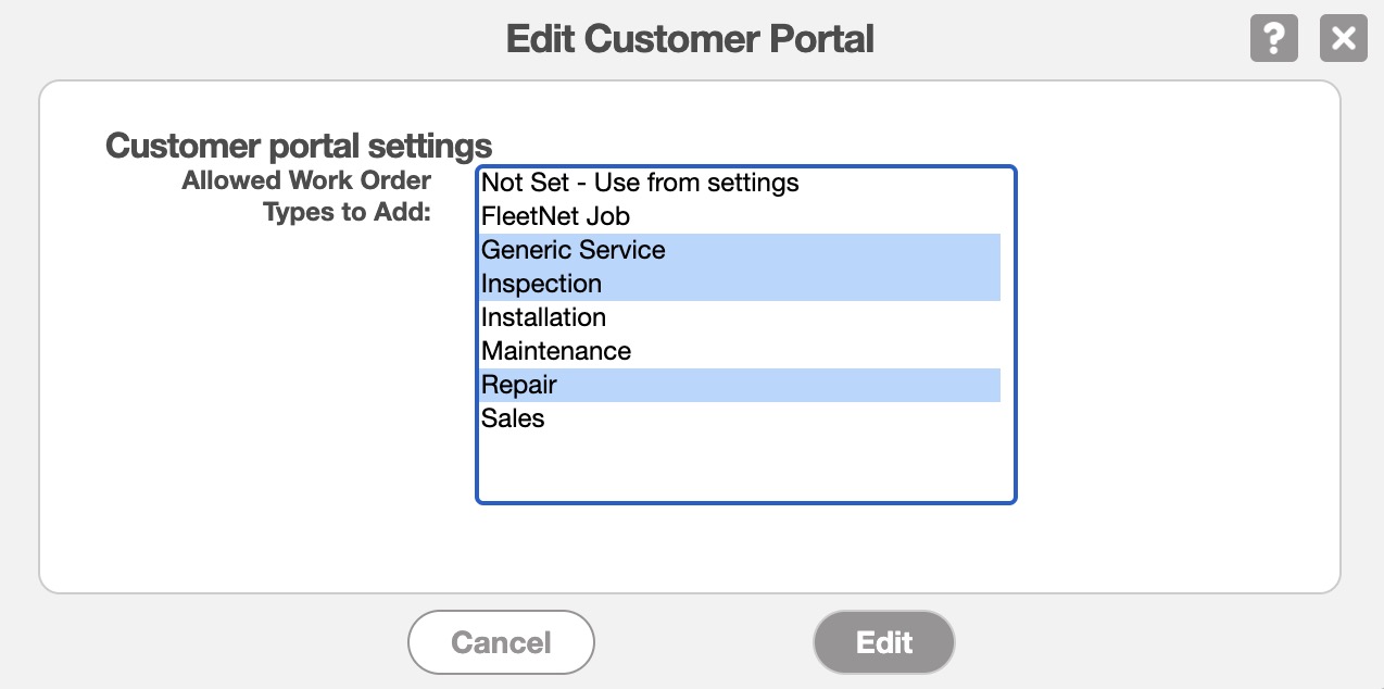 Click to highlight the types of work orders you would like to grant your customers the ability to add; if you would like to add multiple work order types, hold the Command Key (Mac) or Control Key (Windows) on your keyboard. Once satisfied with the selection, click the Edit button to save.