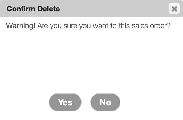 Regardless of the method that the customer chooses to delete their sales order, the Confirm Delete pop-up window will appear. If the customer is positive that they would like to delete the sales order, they should click the Yes button to confirm deletion: