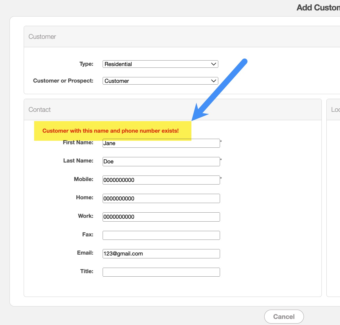 MobiWork will alert you if the customer that you added is a duplicate customer. The image below displays the message you will receive: