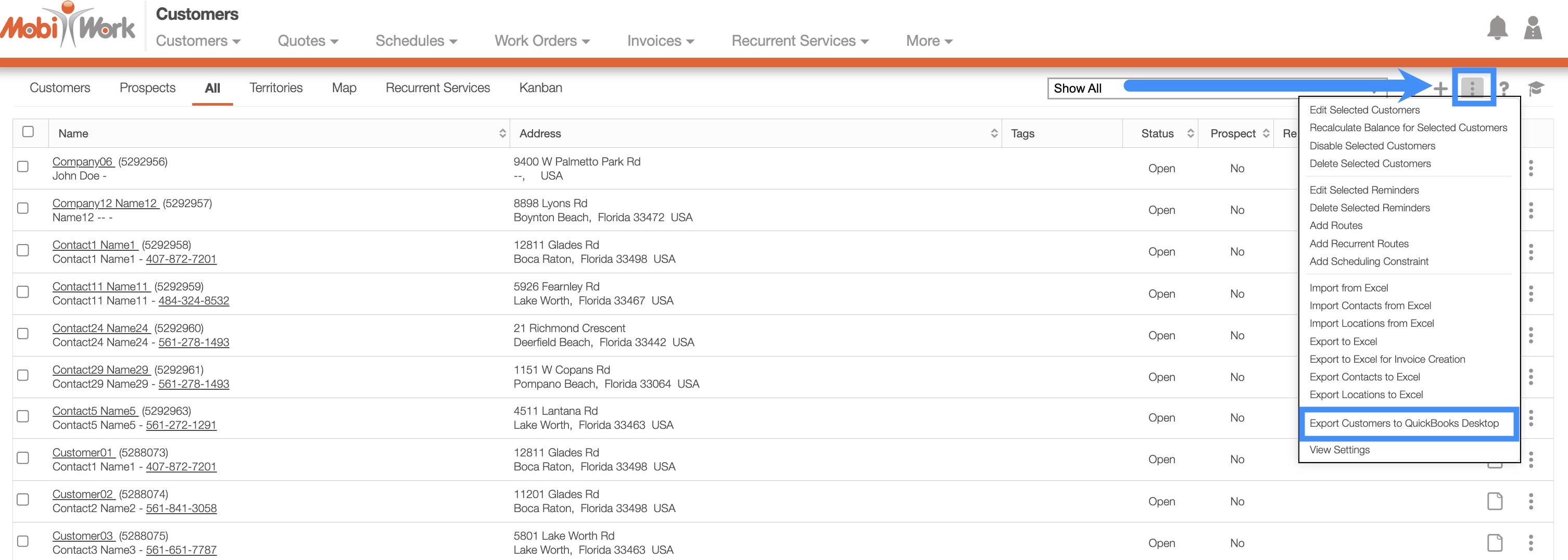 To export your customers into Excel or QuickBooks, you must first access the Customers feature page on MobiWork. For more information on how to access this page, please see the Customer List page: