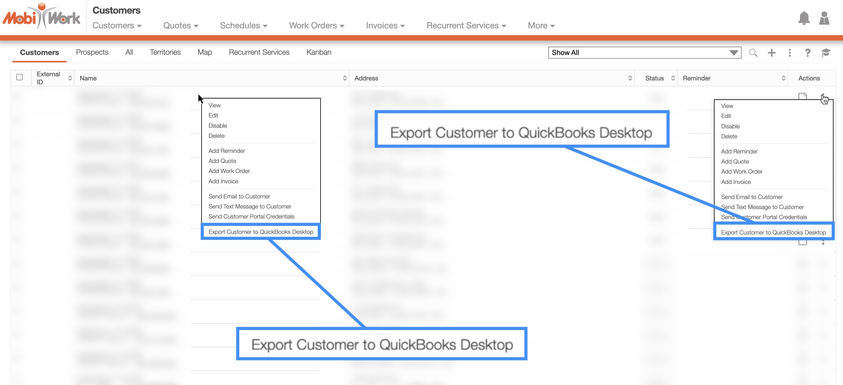 Before exporting your customers into QuickBooks Desktop, please make sure that you have a QuickBooks connector installed into your MobiWork Account. Please see the Connectors Framework: QuickBooks Desktop Web Connector for more information on how to use QuickBooks Desktop with MobiWork.