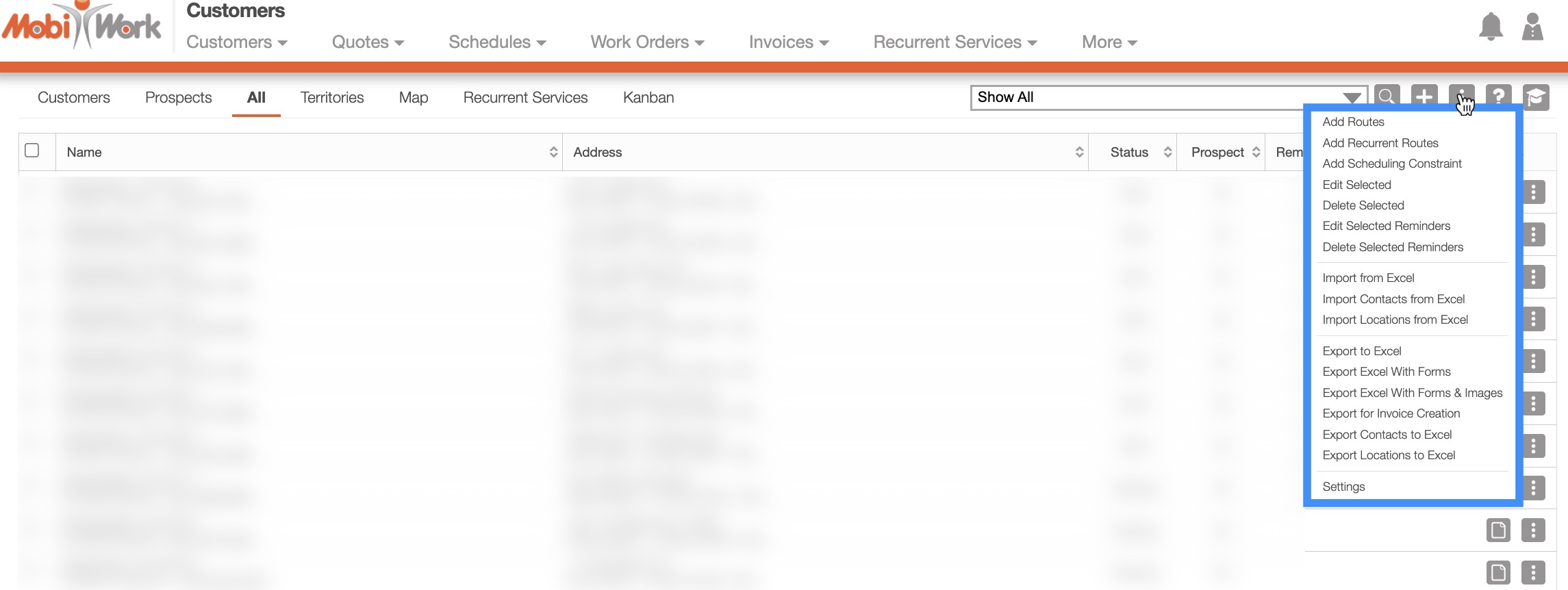 From the More Actions drop-down menu, you can select various actions that will help to manage your customers or prospects, such as viewing the customer profiles, exporting/importing data, adding routes, and more.