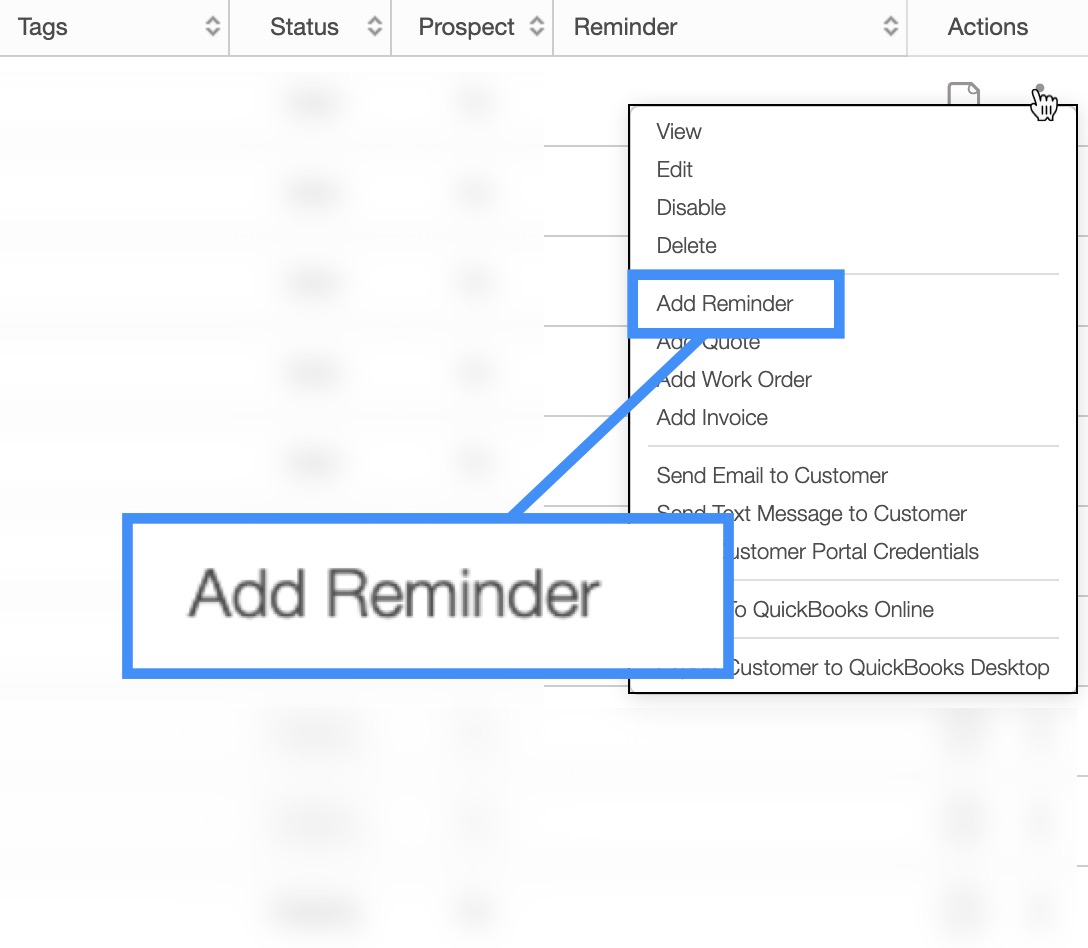 Or clicking on the Individual Actions on the Customers Section and selecting the "Add Reminder" option from the drop-down: