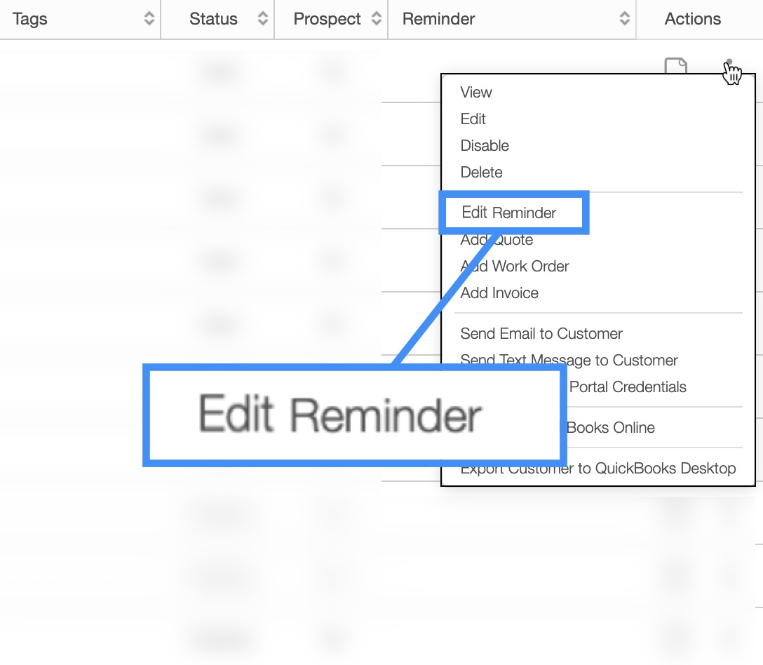 Or clicking on the Individual Actions on the Customers feature page and selecting the "Edit Reminder" option from the drop-down: