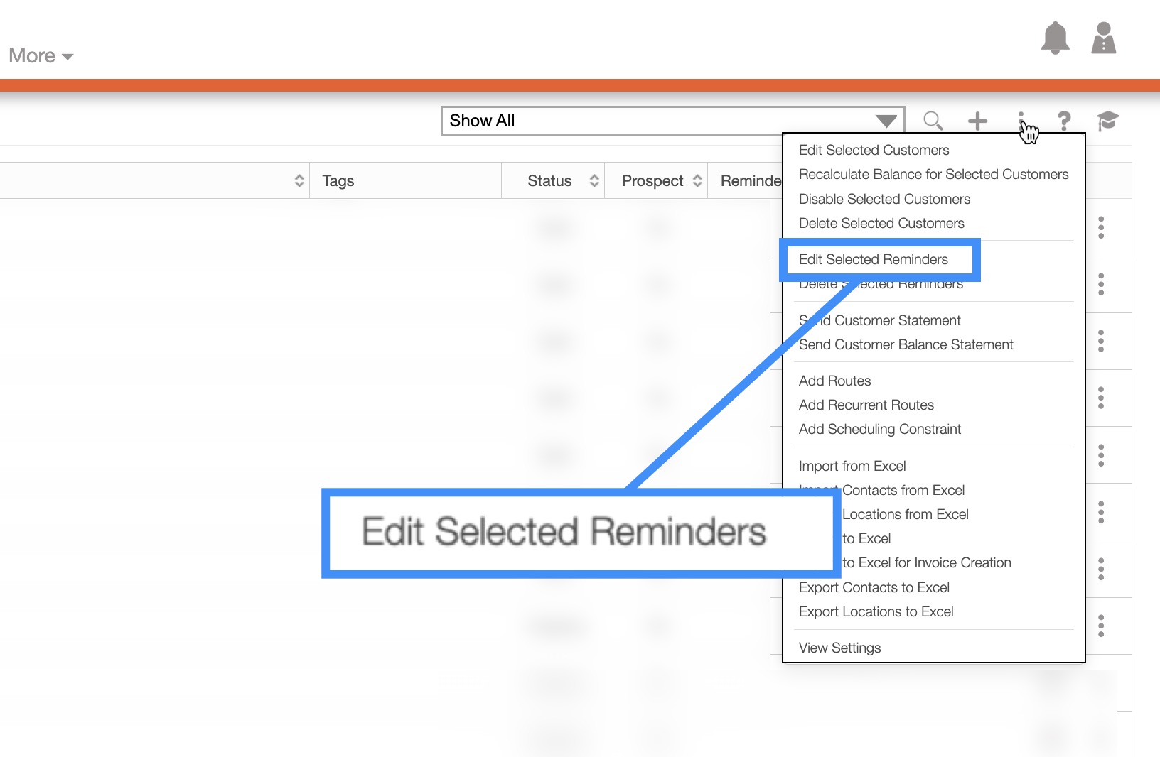 Once you are the Customers feature page, click on the More Actions button to edit or delete reminders assigned to your customers: