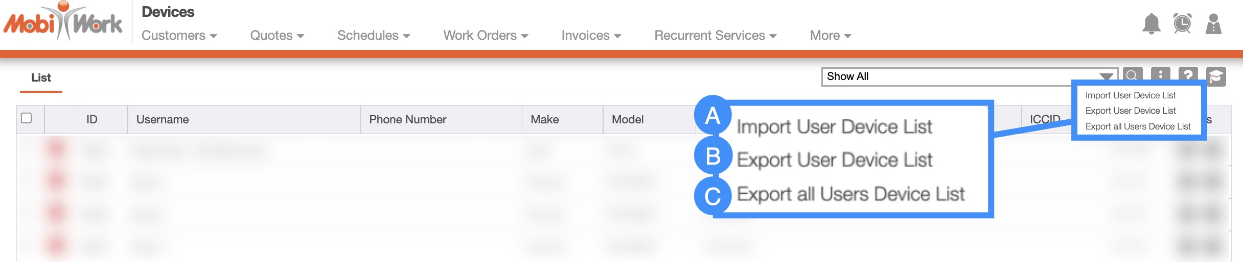 Within MobiWork, you will be able to import and export your User Device Lists; thus, you will be better able to view, edit, and manage your user-associated devices.