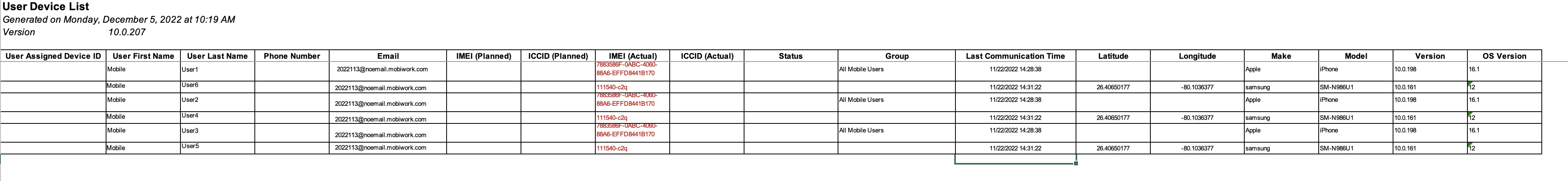 The "User Device List" and "All Users Device List" Excel files will have identical information; both files will have the User Group, the Make and Model of the mobile device, etc.
