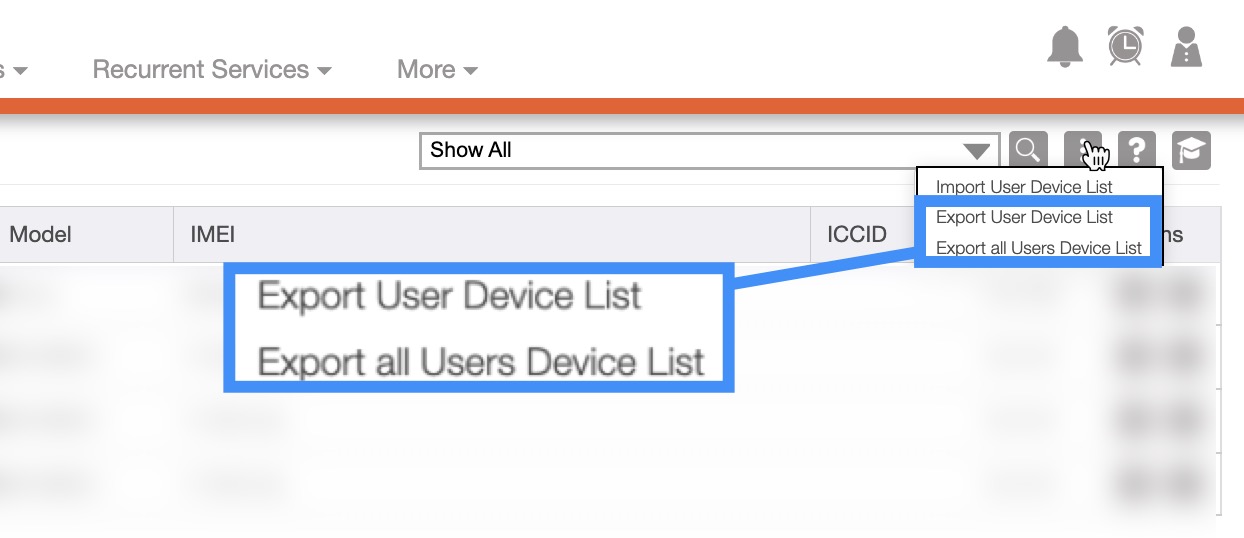 Click on the More Actions button and from the drop-down menu select either the "Export User Device List" or the "Export all Users Device List" option: