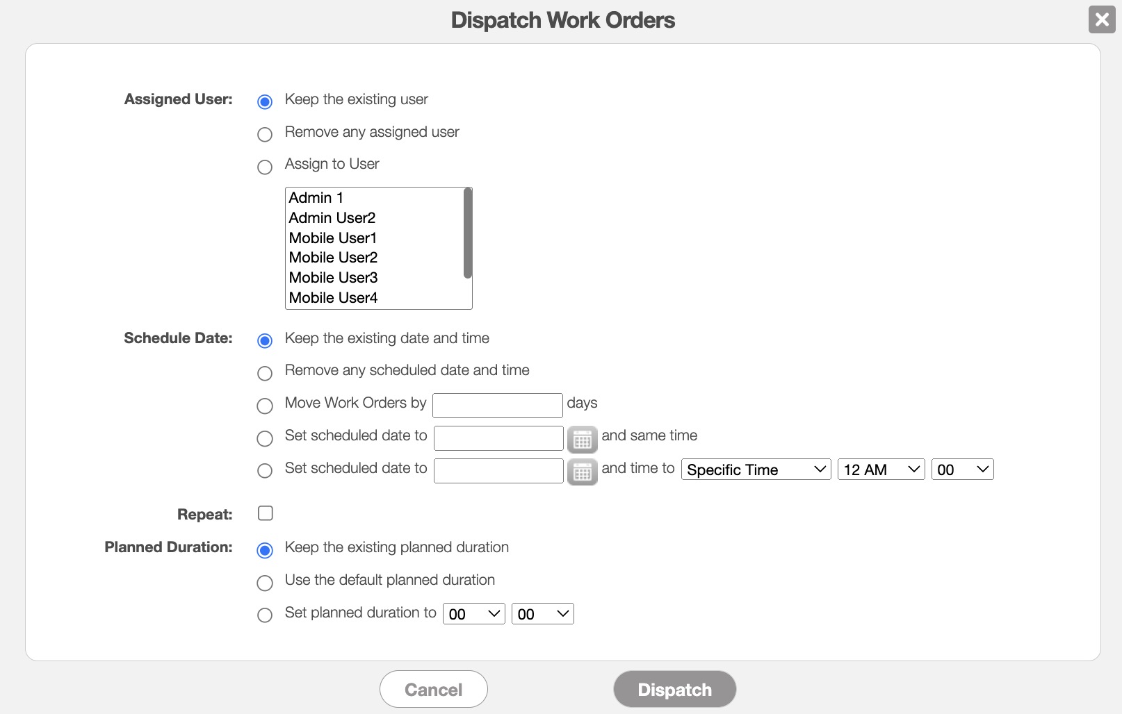 Once you are satisfied with your updates, click the Dispatch button to dispatch the work orders to the assigned user.