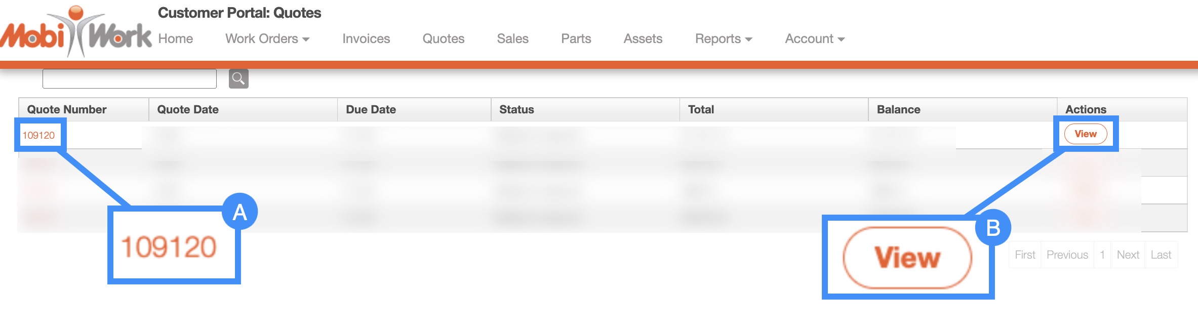 The customer will be able to approve or reject any quotes that are waiting for approval. To approve or reject a quote, you will first need to access the View Quote pop-up window:
