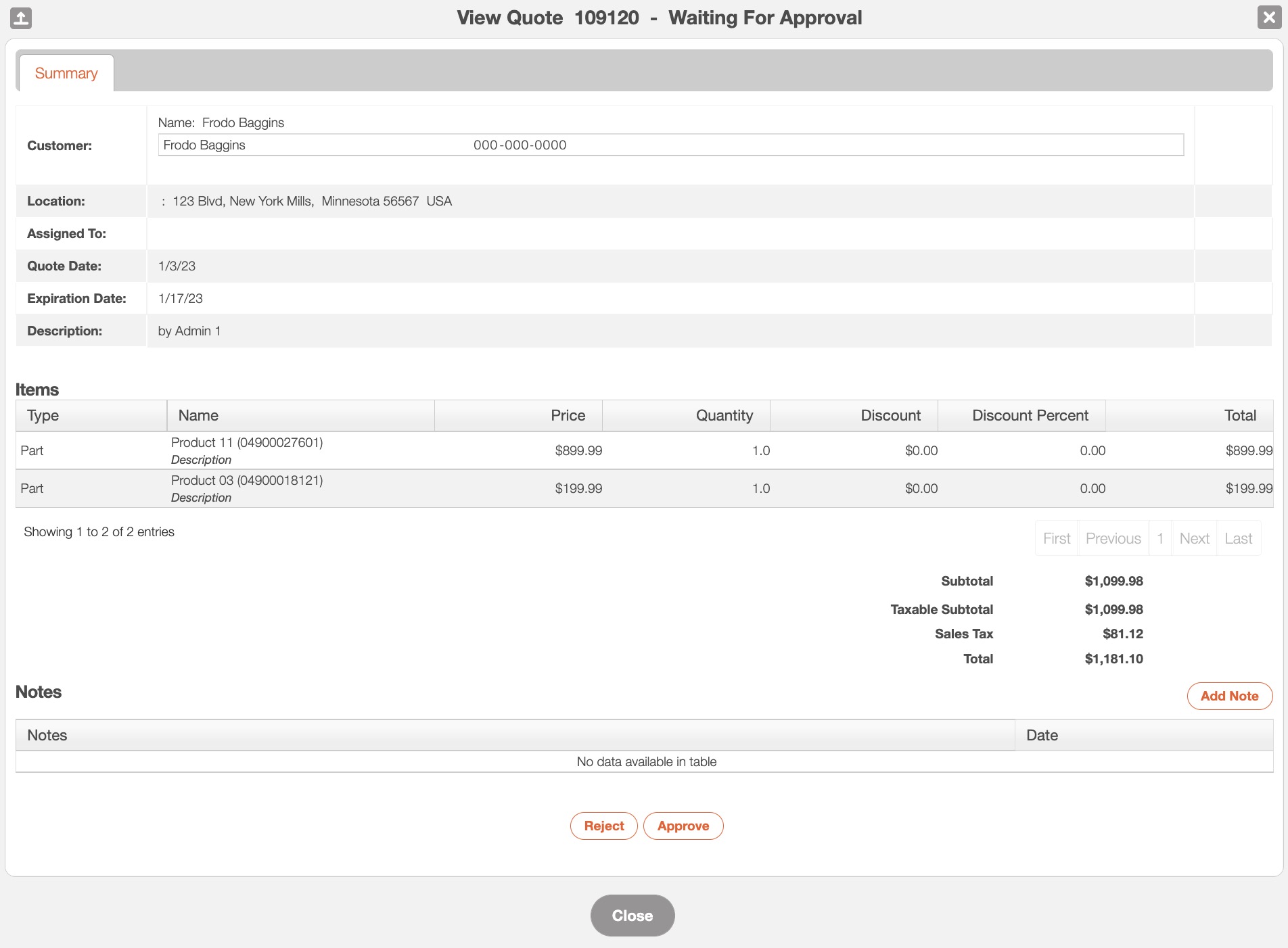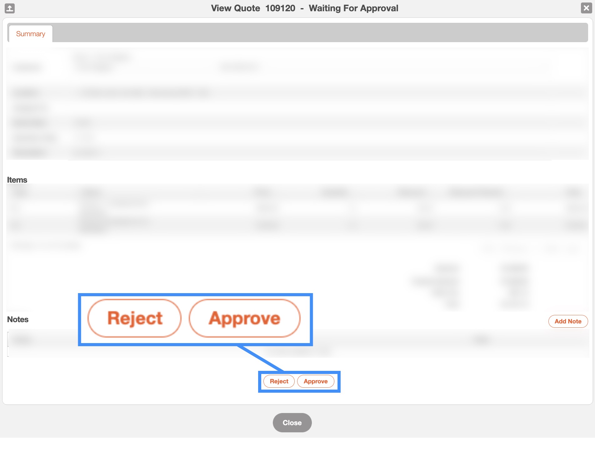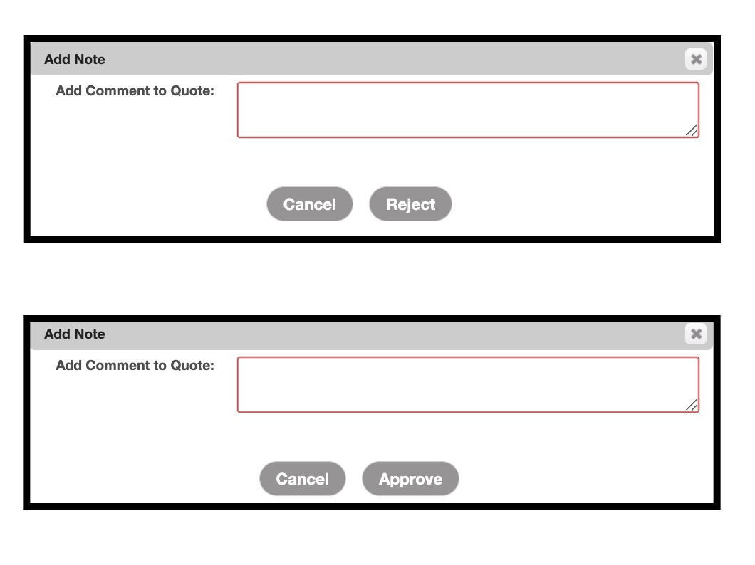 Once the customer has accessed the View Quote pop-up window, they will be able to use the Approve or Reject button to approve or reject the quote.