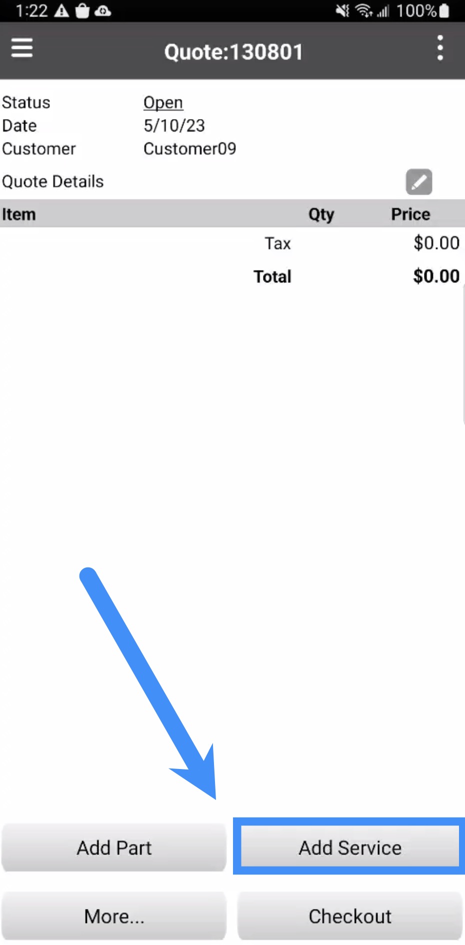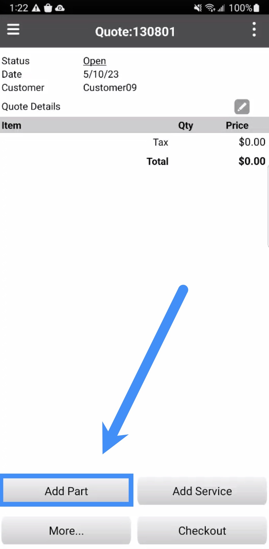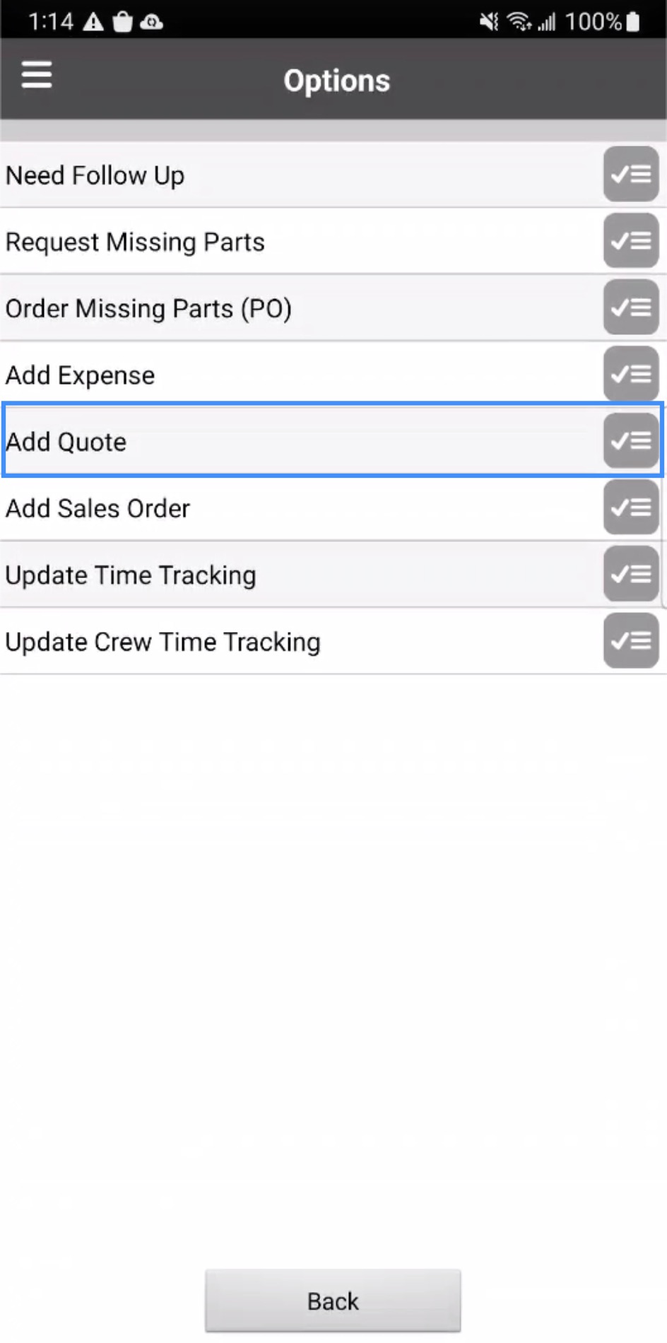 You can also add a new quote from the Secondary Actions Items from the Work Order. For more information on how to access the Secondary Action Items, please see the View Work Order on Device.