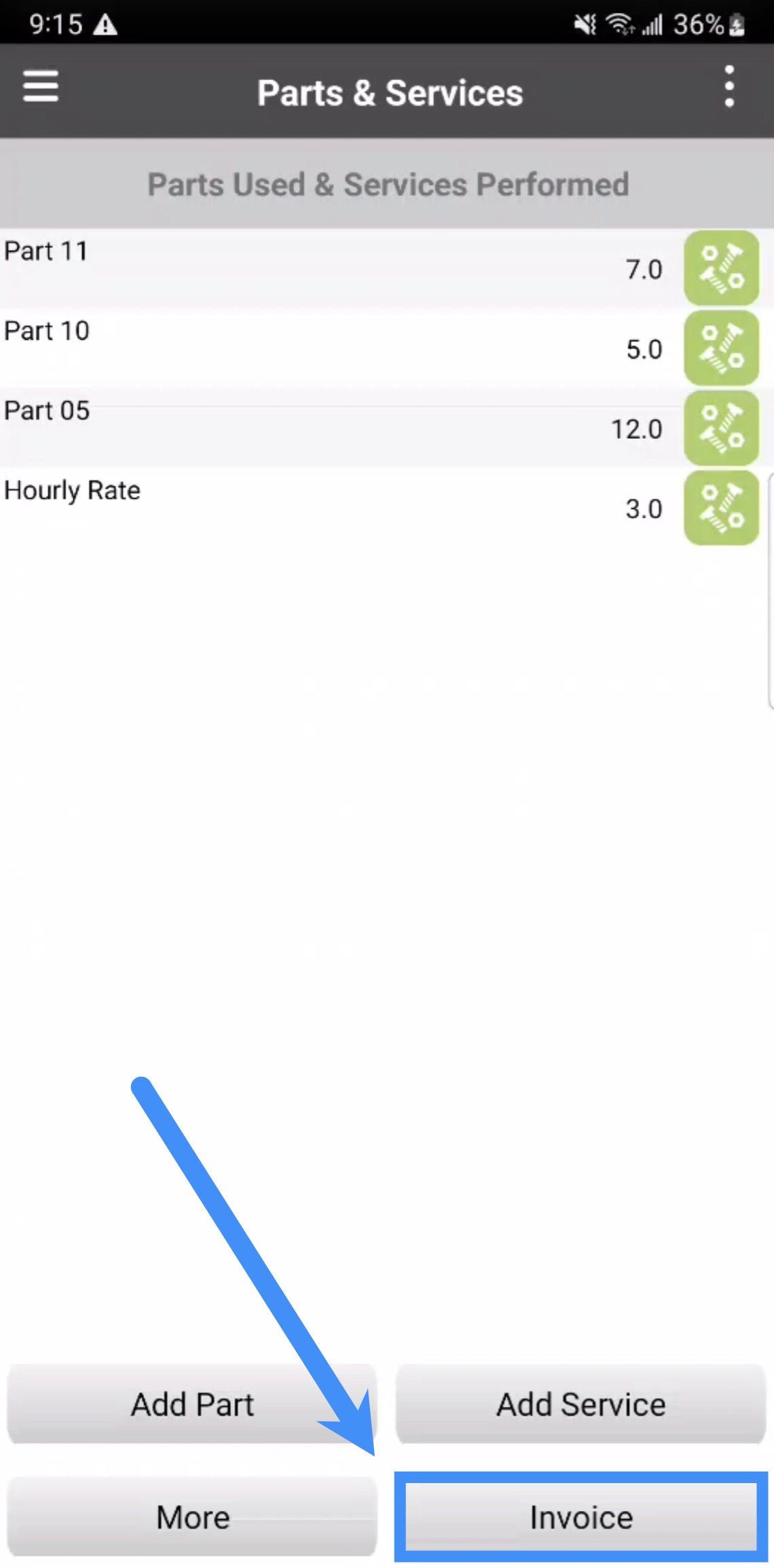 Only once the Parts page is populated can you access the invoice. To navigate to the Invoices feature, press the Invoice button on the bottom right of the Parts page.