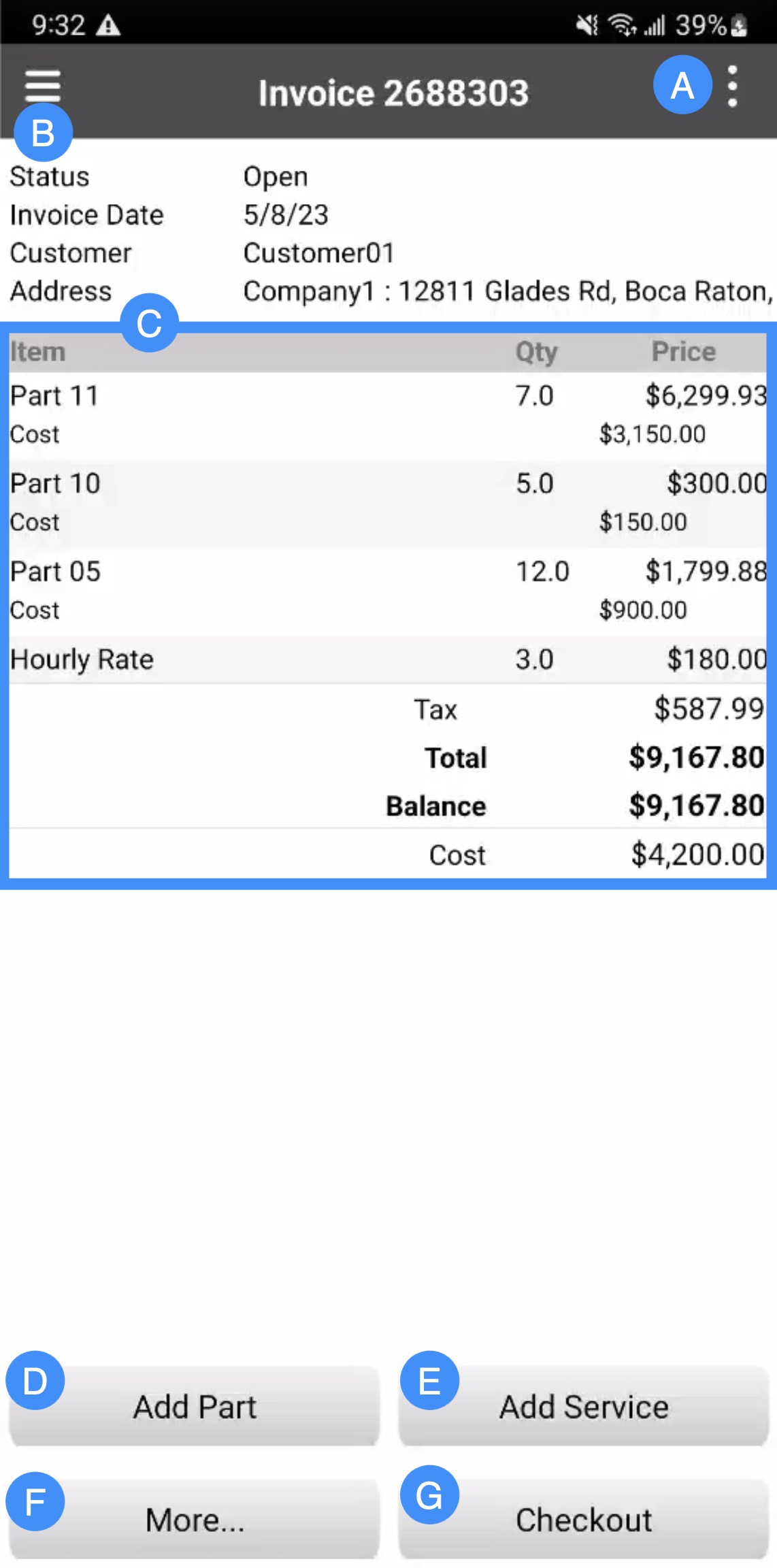 The Add Part button will allow you to add a new item to the invoice.