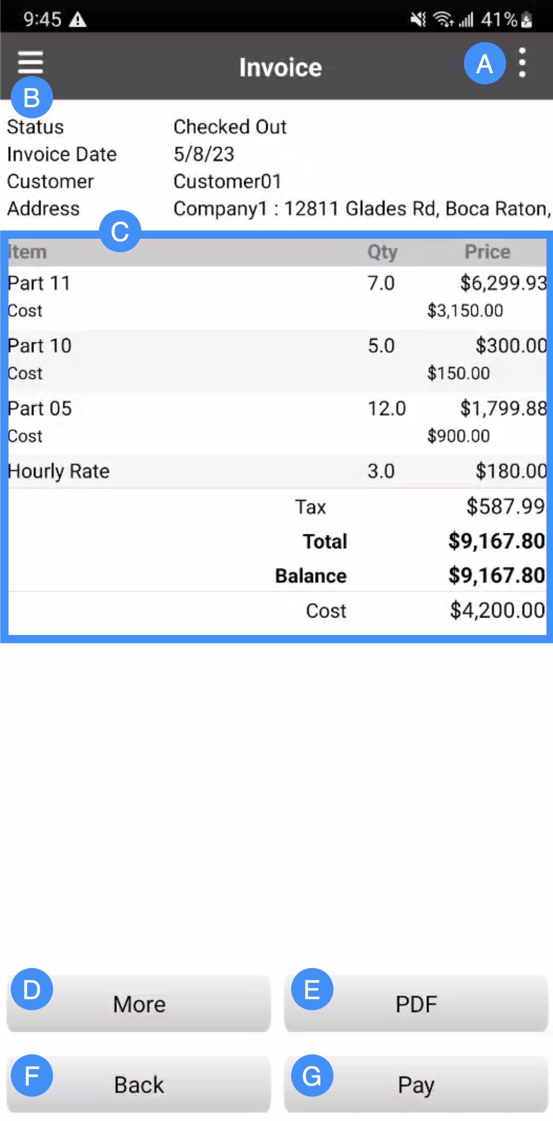 When you first generate an invoice through the selected work order, the layout of the open invoice will be slightly different from a completed or checked out invoice. The example below highlights the layout of an open invoice: