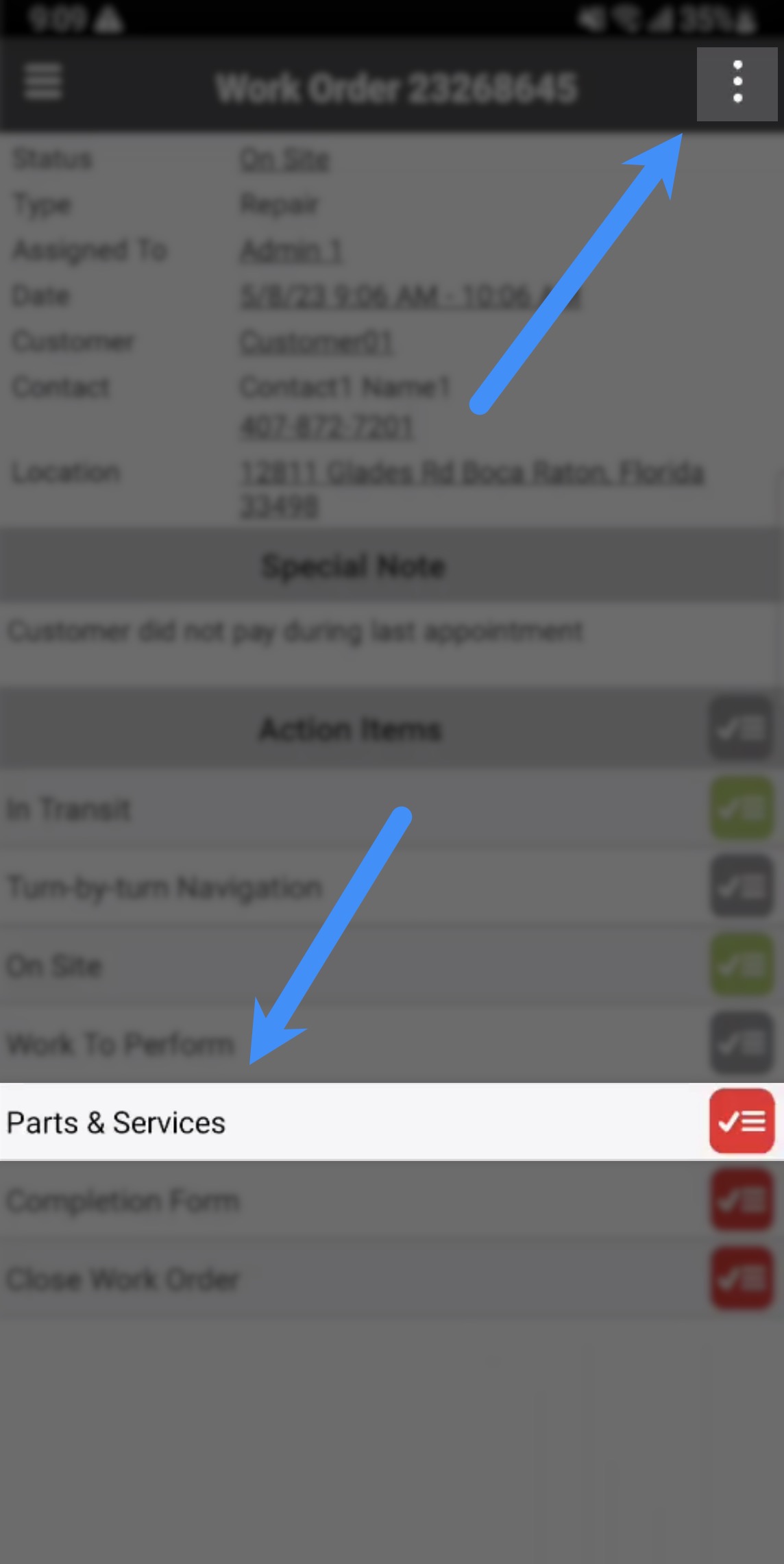 Note: Please note, that for some work orders, you will need to complete the previous red Action Items before adding parts and services. For more information about completing a work order, please see the Complete a Work Order section.