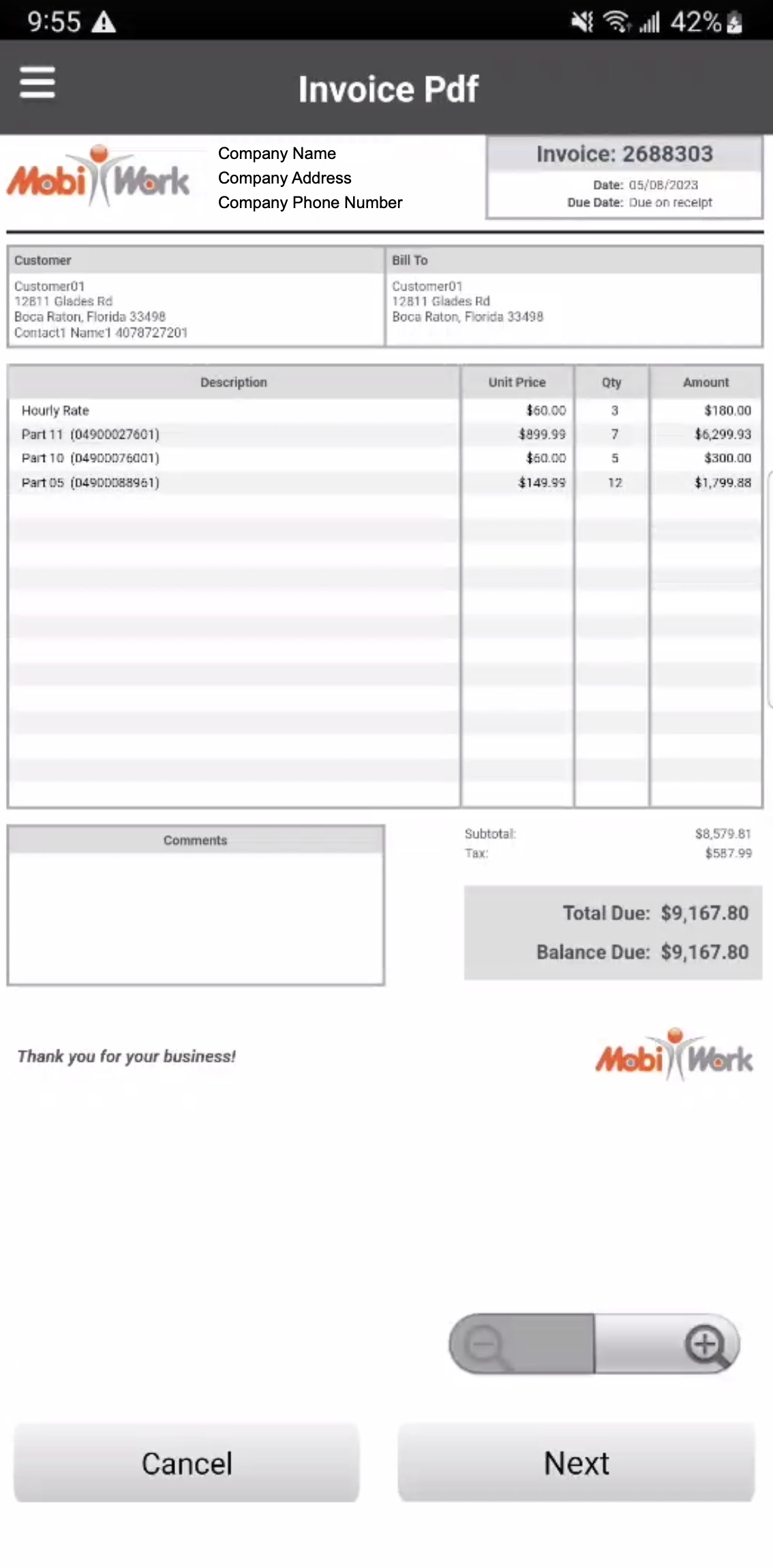You can access the Invoices feature in the MobiWork mobile application through your assigned work orders. Through the Invoices feature you will be able to add parts or services to the invoice, add discounts/markups, export the invoice into a PDF document, and more.