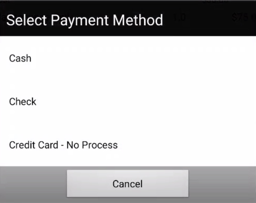 You can easily split payment amounts and methods within the invoice. While issuing a payment for either an open or checked out invoice, select the desired payment method from the Select Payment Method pop-up window: