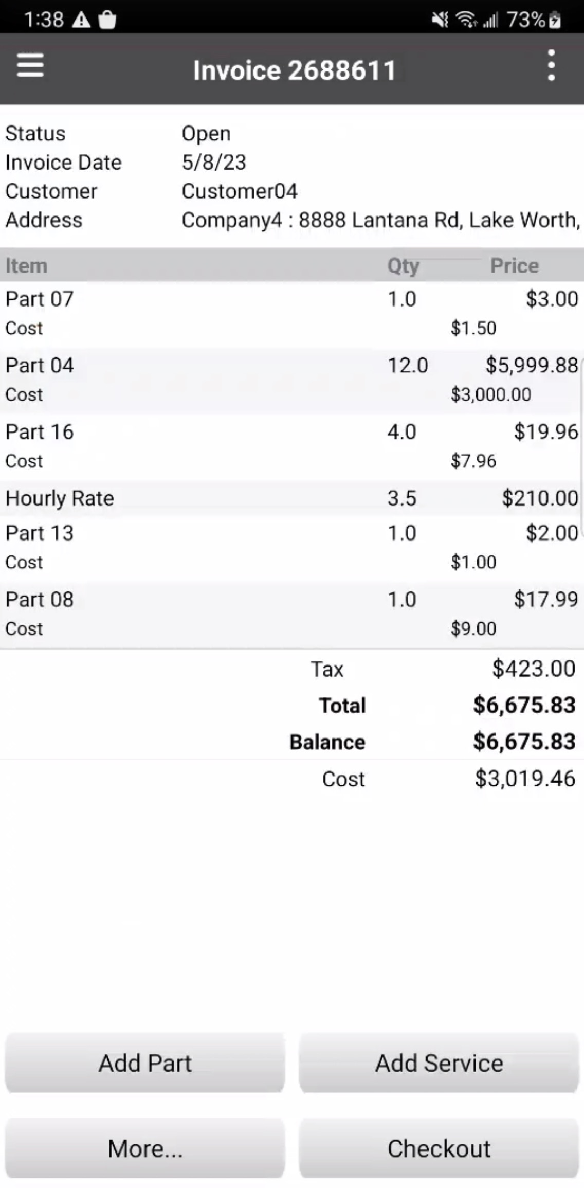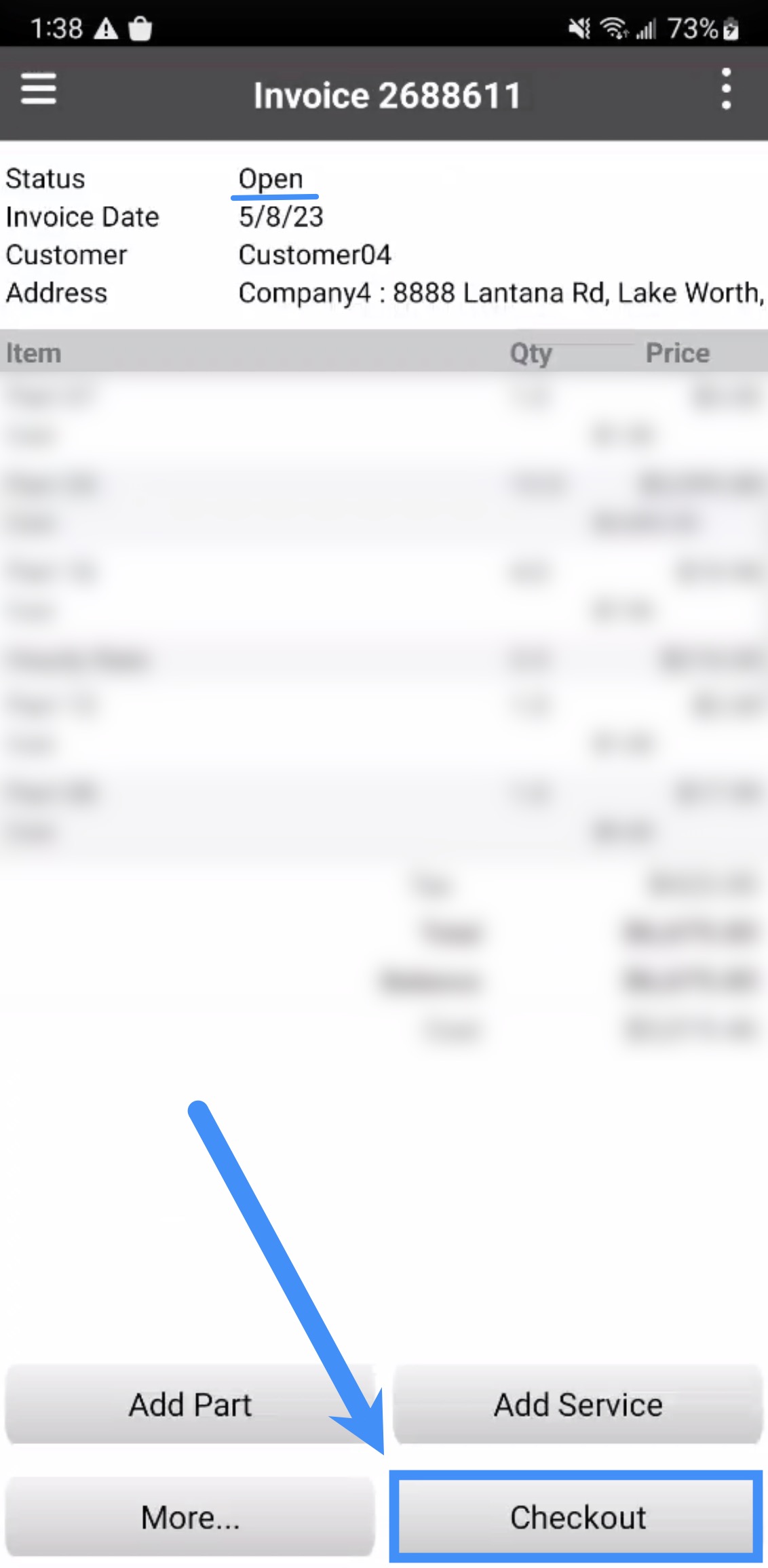 You can easily add payments to your invoices from your mobile device. This section will highlight how to access the payment feature of the selected invoice, expound upon the "Open" and "Checked Out" status, and also how to input split payments.