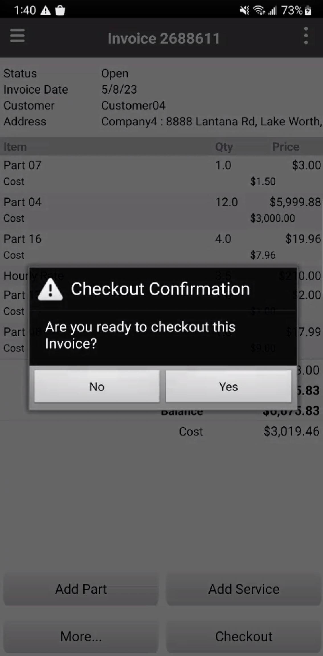 Once you press the Check Out button, a confirmation window will appear asking you to confirm if the invoice should be checked out: