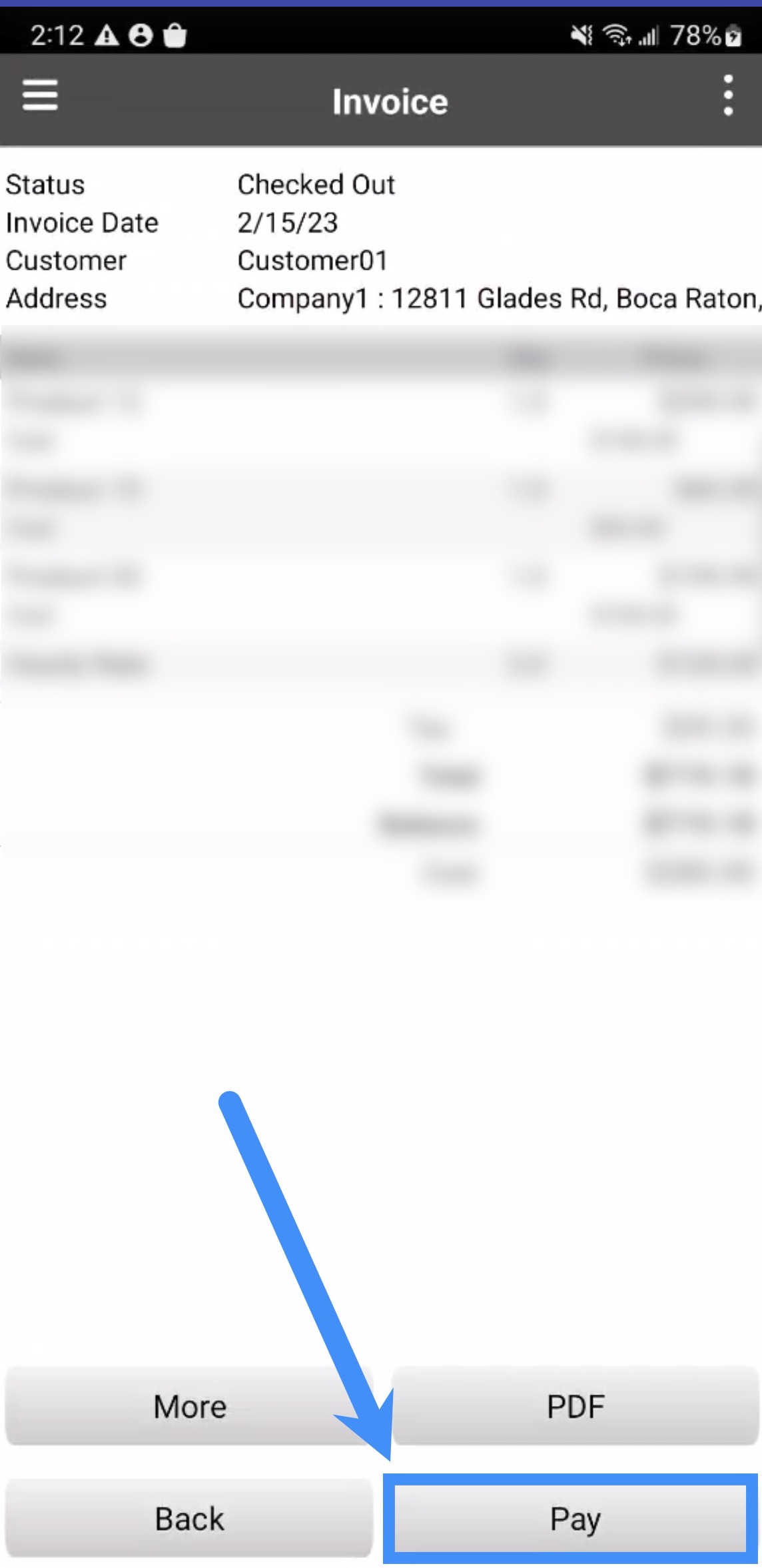 To check out and pay the invoice, you will first need to access the Invoice page. For more information on how to access this page, please see the Mobile Invoices Layout page: