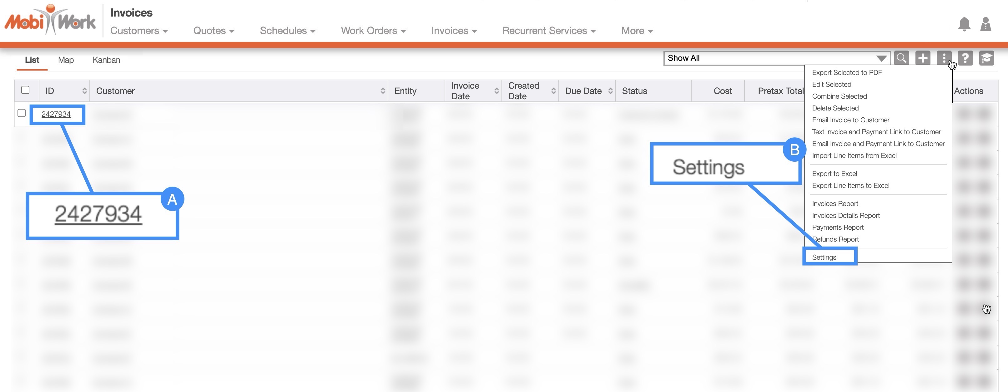 - You can directly access the Settings page by hovering over the Invoices feature from your MobiWork menu, and clicking on the "Settings" option: